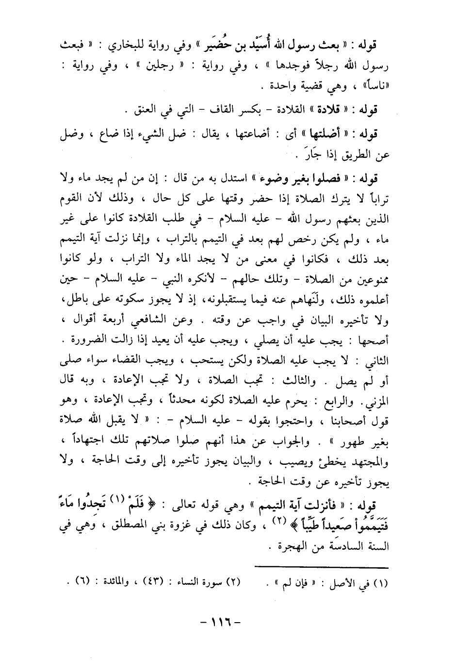 فَتَيَمَّمُوا صَعيداً طيِّباً) (2) ، وكان ذلك في غزوة بني المصطلق، وَهي في
