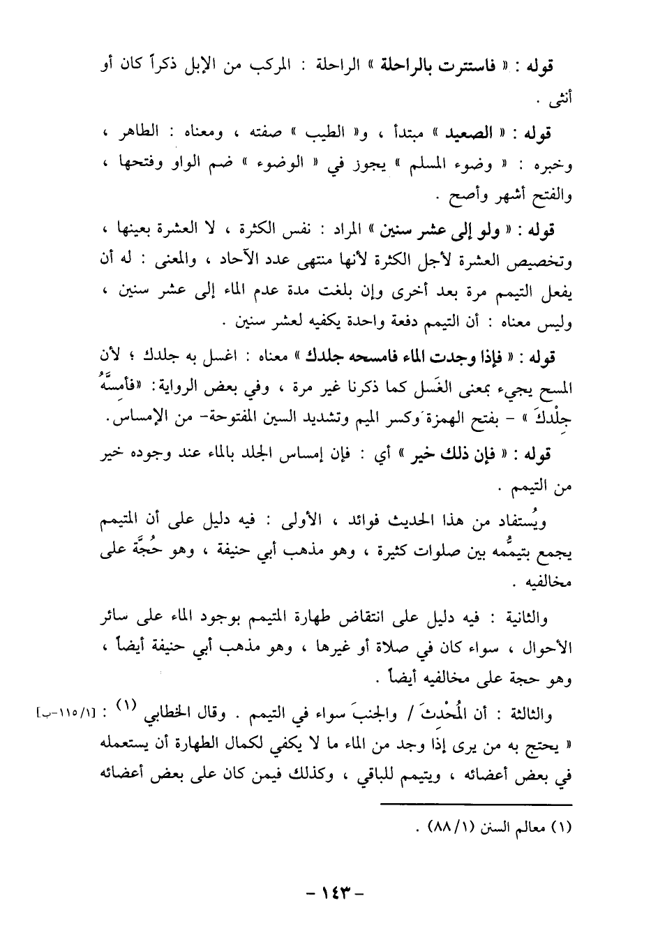 والثالثة: أن المُحدِثَ/والجنبَ سواء في التيمم. وقال الخطابي (1) :