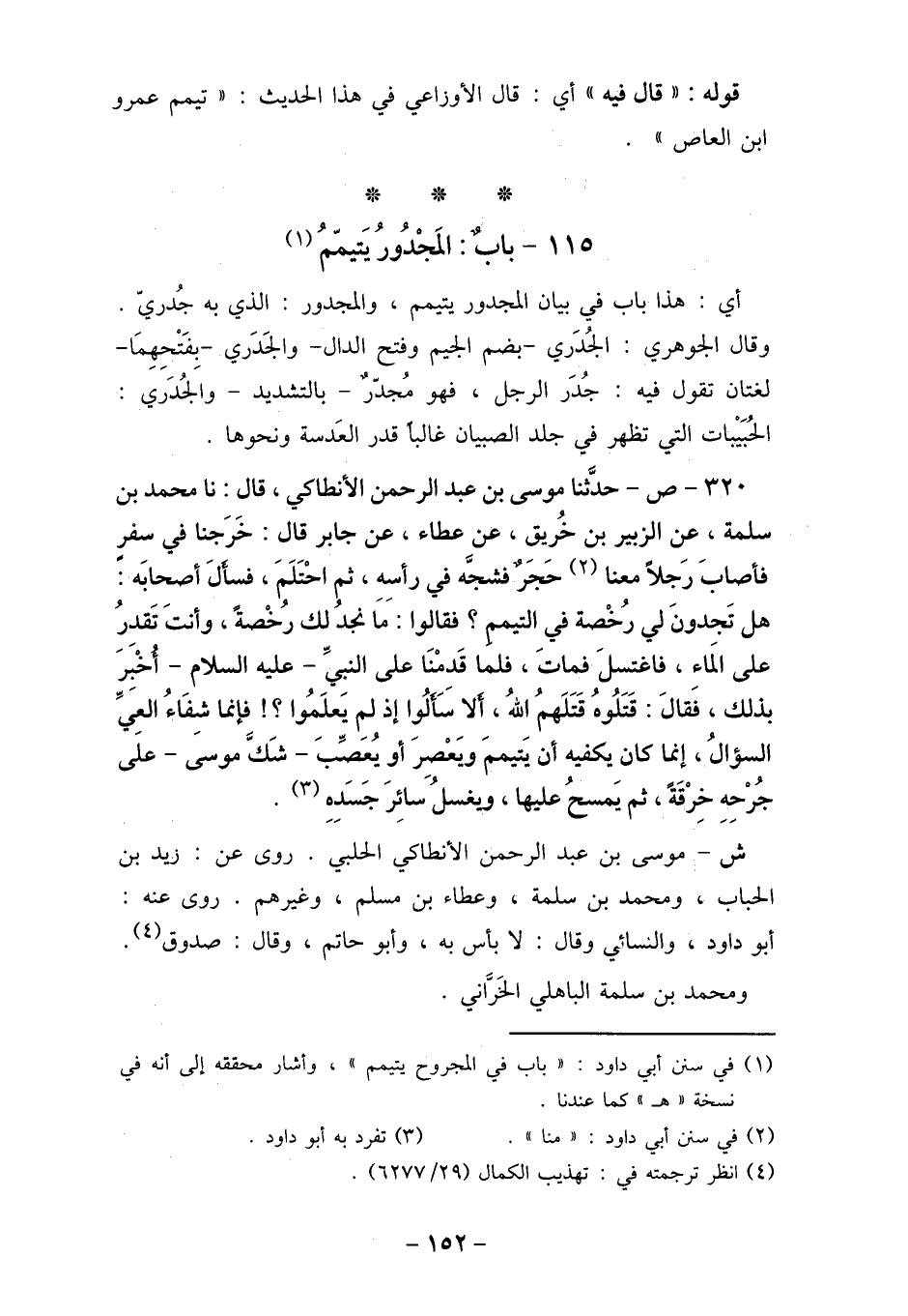 (1) في سنن أبي داود: " باب في المجروح يتيمم "، وأشار محققه إلى أنه في