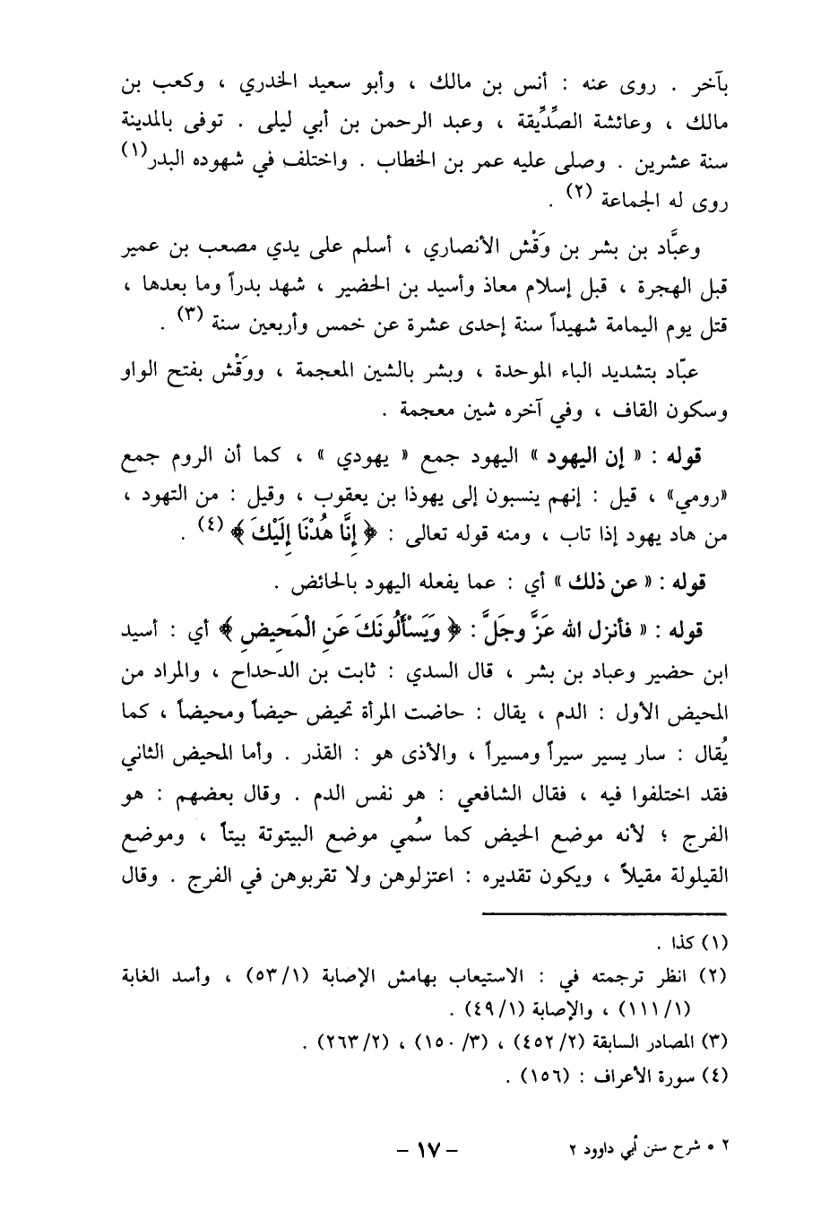 قوله: " فأنزل الله عَر وجَلَّ: (وَيَسألُونَكَ عَنِ المَحِيضِ) أي: أسيد