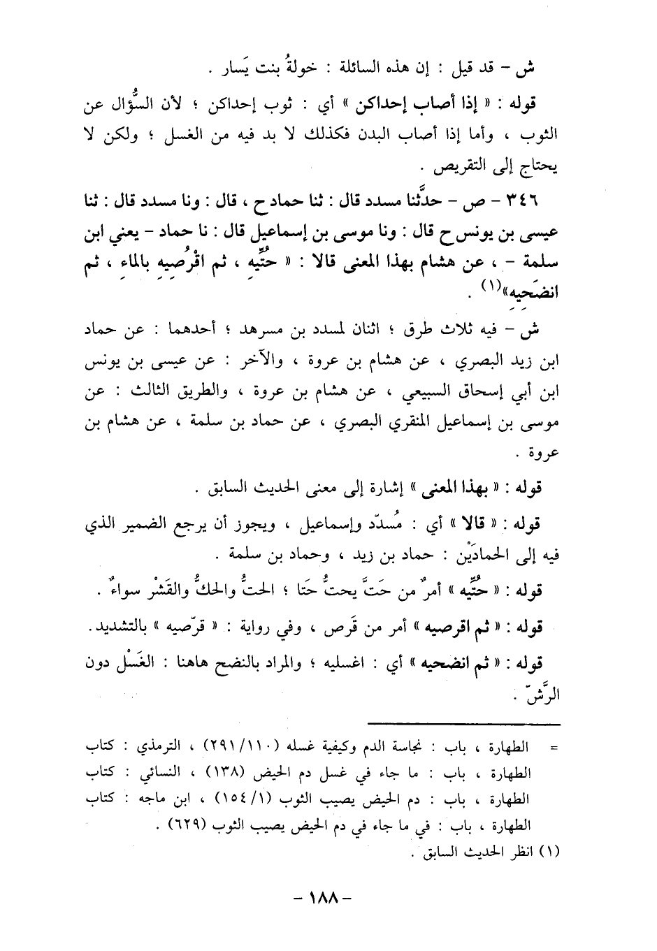 سلمة-، عن هشام بهذا المعنى قالا: " حتيه، ثم اقرُصيه بالماء، ثم