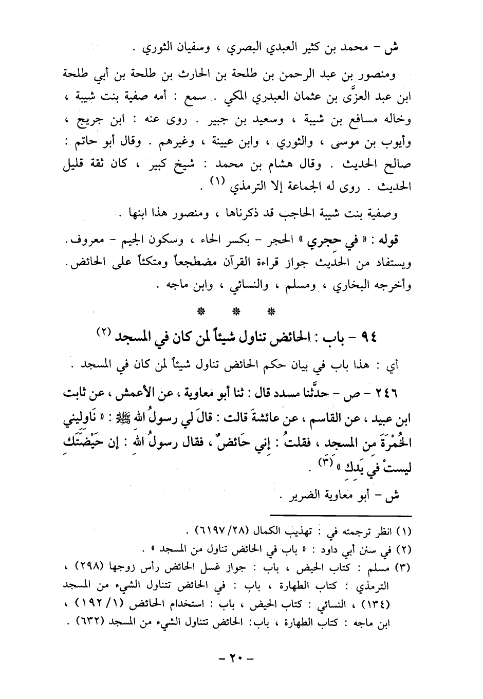 (2) في سنن أبي داود: " باب في الحائض تناول من المسجد " 0