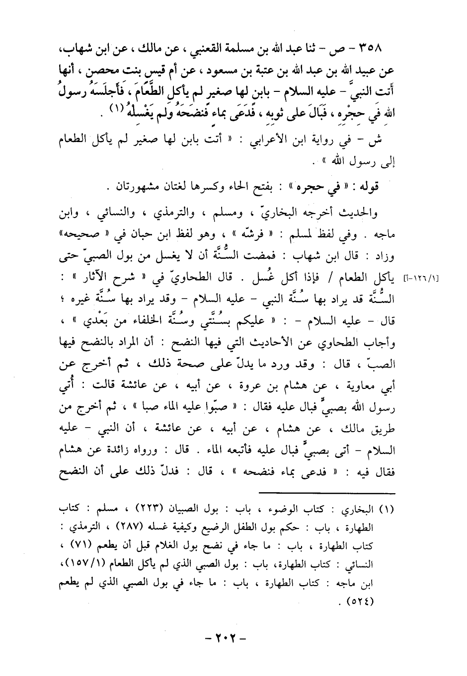 السلام- أتى بصبيِّ فبال عليه فأتبعه الماء. قال: ورواه زائدة عن هشام
