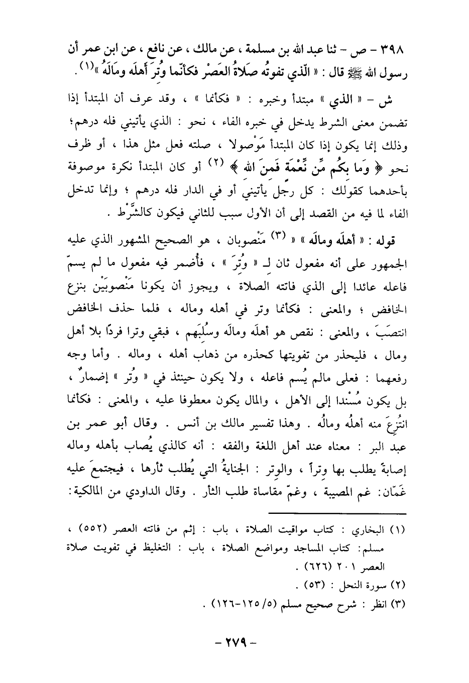 مسلم: كتاب المساجد ومواضع الصلاة، باب: التغليظ في تفويت صلاة