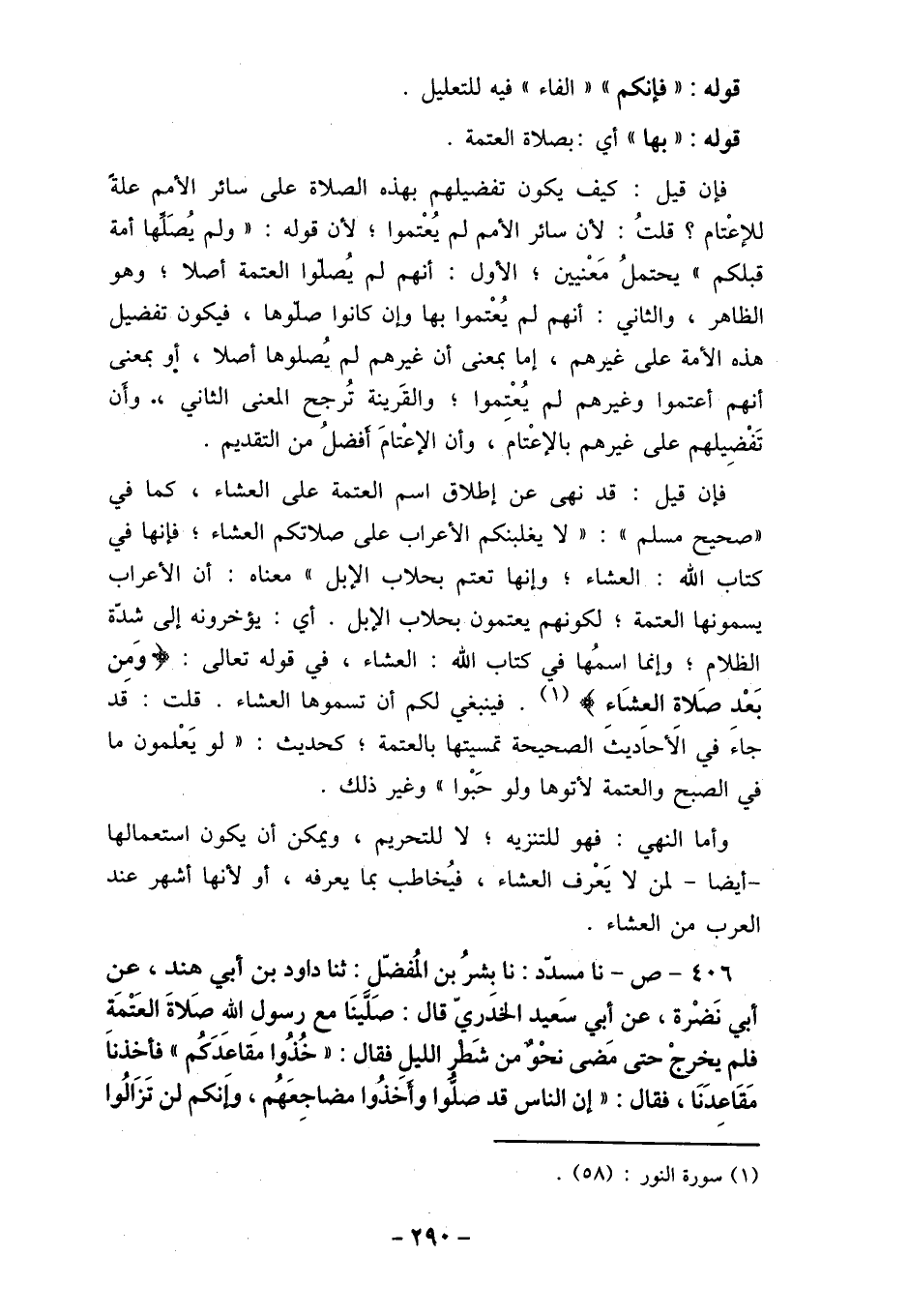 كتاب الله: العشاء؛ وإنها تعتم بحلاب الإبل " معناه: أن الأعراب
