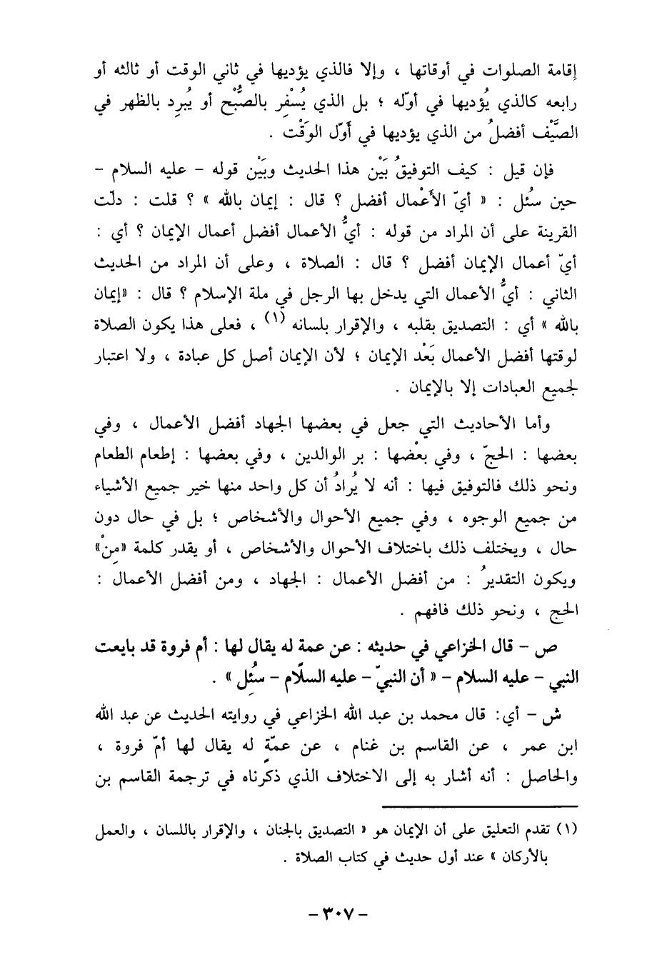 أي أعمال الإيمان أفضل؟ قال: الصلاة، وعلى أن المراد من الحديث