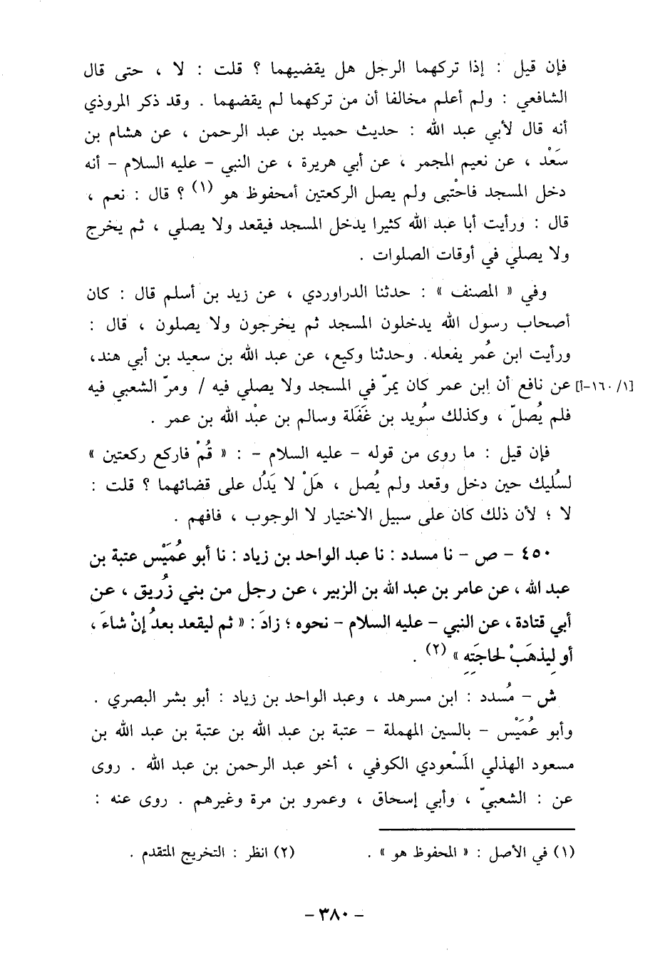عن نافع أن. ابن عمر كان يمر في المسجد ولا يصلى فيه/ومرّ الشعبي فيه