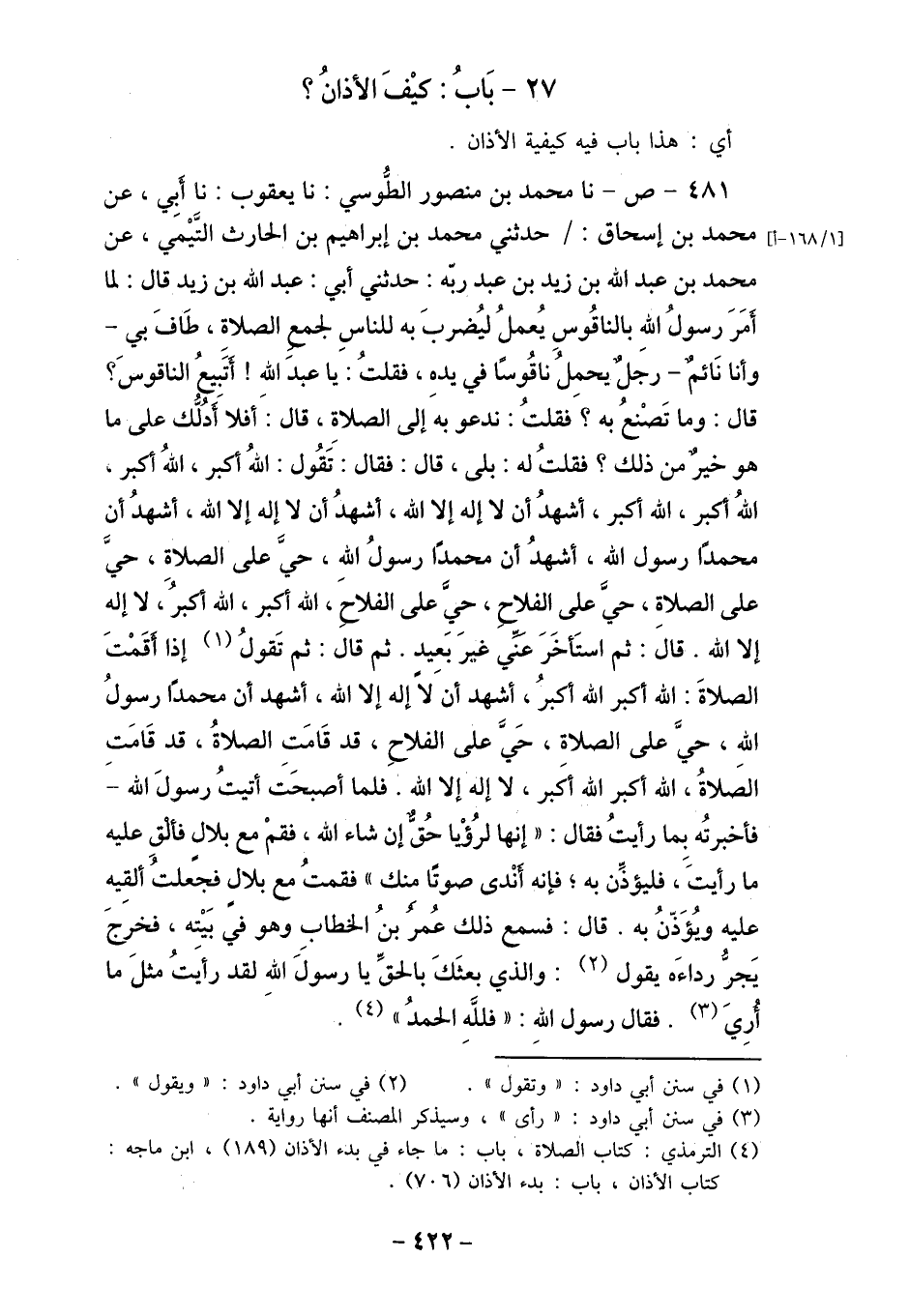 (4) الترمذي: كتاب الصلاة، باب: ما جاء في بدء الأذان (189) ، ابن ماجه: