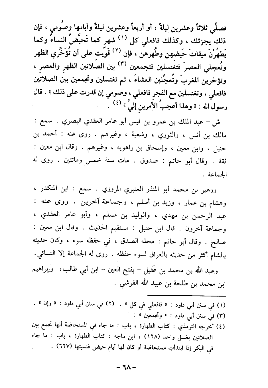 (4) أخرجه الترمذي: كتاب الطهارة، باب: ما جاء في المستحاضة أنها تجمع بين