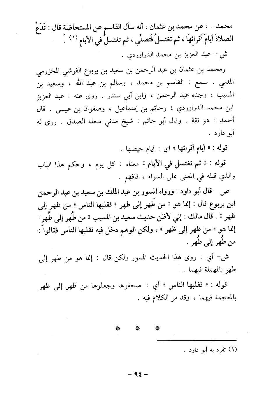 محمد-، عن محمد بن عثمان، أنه سأل القاسم عن المستحاضة قال: تَدعُ