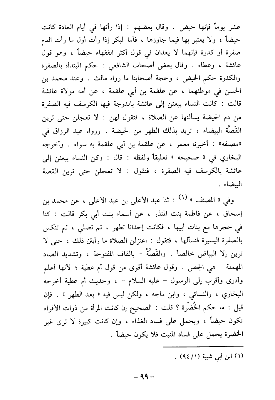 قيل: ما حكم الخُضرة؟ قلت: الصحيح إن كانت المرأة من ذوات الأقراء