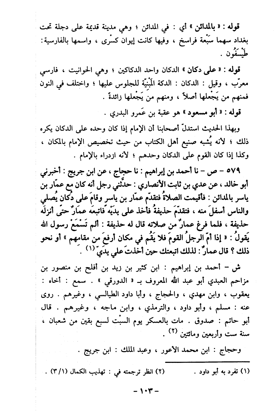 579- ص- نا أحمد بن إبراهيم: نا حجاج، عن ابن جريج: أخبرني أبو خالد، عن عدي بن ثابت الأنصاري: حدثني رجل أنه كان مع عمار بن ياسر بالمدائن: فأقيمت الصلاةُ فتقدّم عمّار بن ياسر وقامَ على دُكانٍ يُصلي والناس أسفلَ منه، فتقدّمَ حذيفةُ فأخذ على يدَيْهً فاتبعَه عمَار حتى أنزلَه حذيفة، فلما فرغ عمار من صلاته قال له حذيفة: ألم تَسْمَعْ رسول الله يَقولُ: " إذا أم الرجلُ القومَ فلا يَقُم في مكان أرفعِ من مقامِهم " أو نحو ذلك؟ قال عمار: لذلك اتبعتك حين أخذتَ علي يدي (1) .