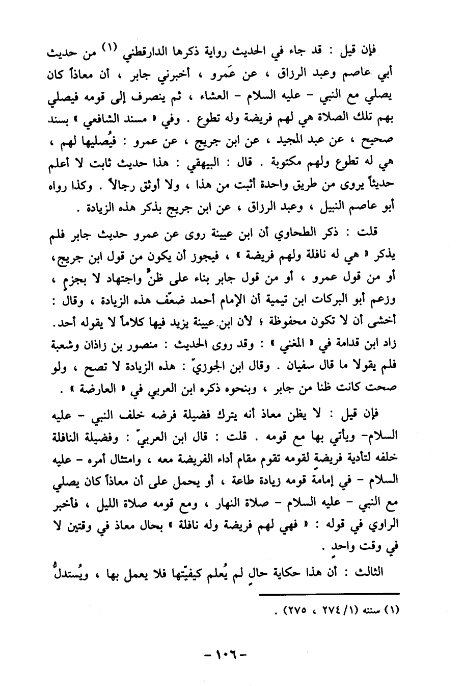 أبي عاصم وعبد الرزاق، عن عَمرو، أخبرني جابر، أن معاذا كان يصلي مع النبي- عليه السلام- العشاء، ثم ينصرف إلى قومه فيصلي بهم تلك الصلاة هي لهم فريضة وله تطوع. وفي " مسند الشافعي " بسند صحيح، عن عبد المجيد، عن ابن جريج، عن عمرو: فيُصليها لهم، هي له تطوع ولهم مكتوبة. قال: البيهقي: هذا حديث ثابت لا أعلم حديثاً يروى من طريق واحدة أثبت من هذا، ولا أوثق رجالا. وكذا رواه أبو عاصم النبيل، عبد الرزاق، عن ابن جريج بذكر هذه الزيادة. قلت: ذكر الطحاوي أن ابن عيينة روى عن عمرو حديث جابر فلم يذكر " هي له نافلة ولهم فريضة "، فيجور أن يكون من قول ابن جريج، أو من قول عمرو، أو من قول جابر بناء على ظن واجتهاد لا بجزم "، وزعم أبو البركات ابن تيمية أن الإمام أحمد ضعف هذه الزيادة، وقال: أخشى أن لا تكون محفوظة، لأن ابن عيينة يزيد فيها كلاما لا يقوله أحد. زاد ابن قدامة في " المغني ": وقد روى الحديث: منصور بن زاذان وشعبة فلم يقولا ما قال سفيان. وقال ابن الجوزي: هذه الزيادة لا تصح، ولو صحت كانت ظنا من جابر، وبنحوه ذكره ابن العربي في " العارضة ". فإن قيل: لا يظن معاذ أنه يترك فضيلة فرضه خلف النبي- عليه السلام- ويأتي بها مع قومه. قلت: قال ابن العربي: وفضيلة النافلة خلفه لتأدية فريضة لقومه تقوم مقام أداء الفريضة معه، وامتثال أمره- عليه السلام- في ثمامة قومه زيادة طاعة، أو يحمل على أن معاذا كان يصلي مع النبي- عليه السلام- صلاة النهار، ومع قومه صلاة الليل، فأخبر الراوي في قوله: " فهي لهم فريضة وله نافلة، بحال معاذ في وقتين لا في وقت واحدِ.