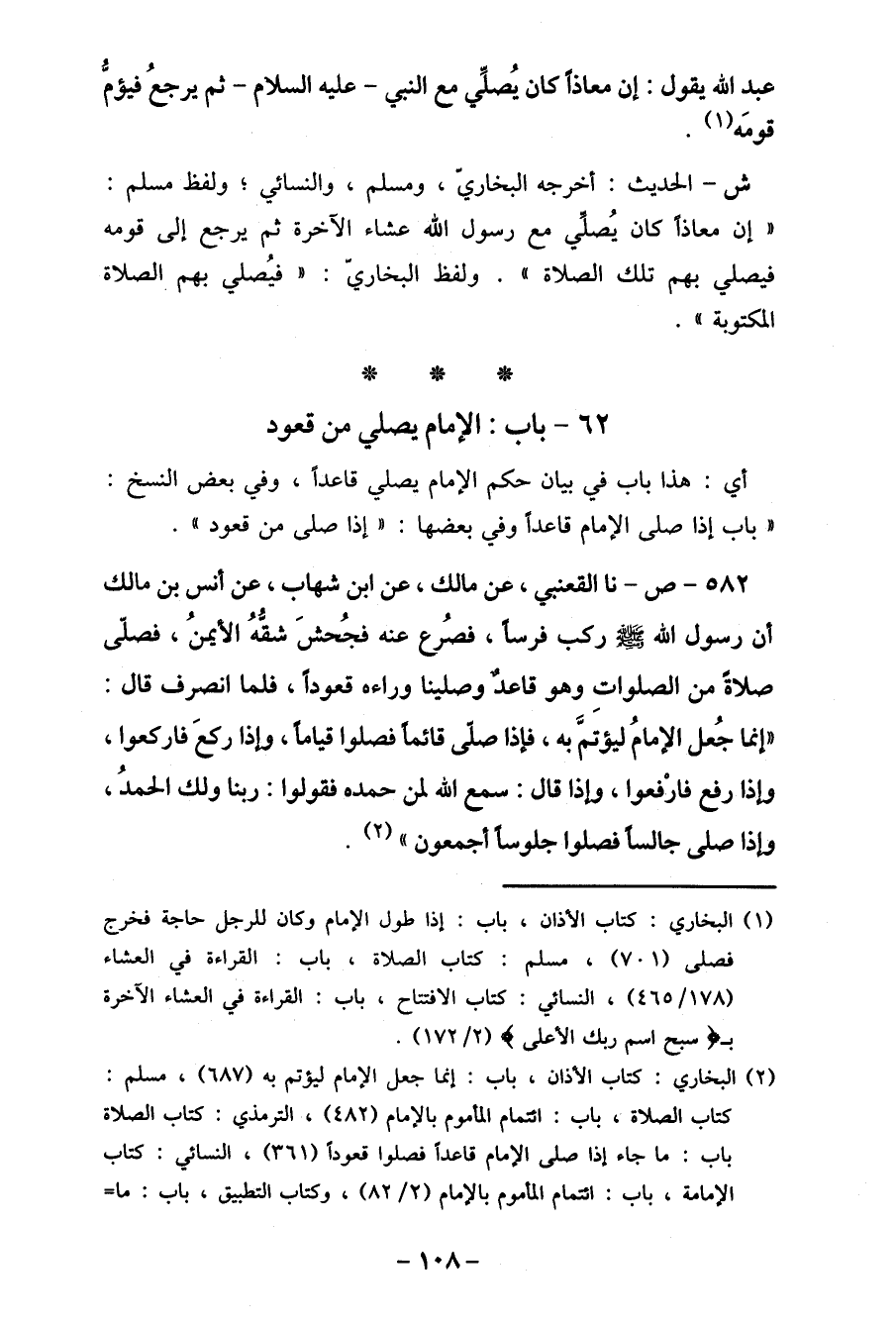 (2) البخاري: كتاب الأذان، باب: إنما جعل الإمام ليؤتم به (687) ، مسلم: كتاب الصلاة، باب: ائتمام المأموم بالإمام (482) ، الترمذي: كتاب الصلاة باب: ما جاء إذا صلى الإمام قاعدا فصلوا قعوداَ (361) ، النسائي: كتاب الإمامة، باب: الإمام المأموم الإمام (2 / 82) ، وكتاب التطبيق، باب: ما=
