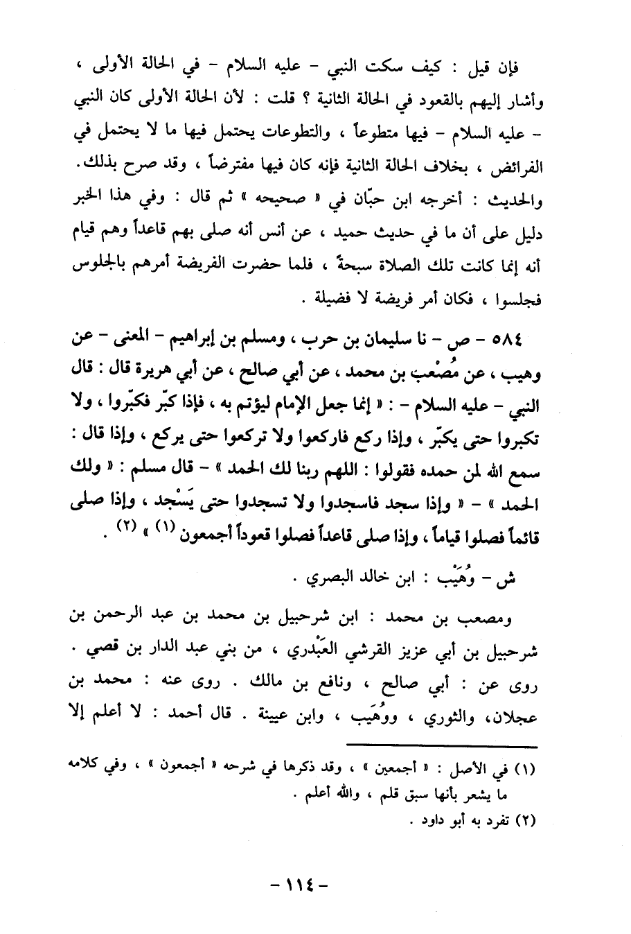 584- ص- نا سليمان بن حرب، ومسلم بن إبراهيم- المعنى- عن وهيب، عن مُصْعب بن محمد، عن أبي صالح، عن أبي هريرة قال: قال النبي- عليه السلام-: " إنما جعل الإمام ليؤتم به، فإذا كبر فكبروا، ولا تكبروا حتى يكبر، وإذا ركع فاركعوا ولا تركعوا حتى يركع، وإذا قال: سمع الله لمن حمده فقولوا: اللهم ربنا لك الحمد "- قال مسلم: " ولك الحمد "- " وإذا سجد فاسجدوا ولا تسجدوا حتى يَسْجد، وإذا صلى قائما فصلوا قياما، وإذا صلى قاعدا فصلوا قعودا أجمعون (1) " (2) . ش- وُهَيْب: ابن خالد البصري.
