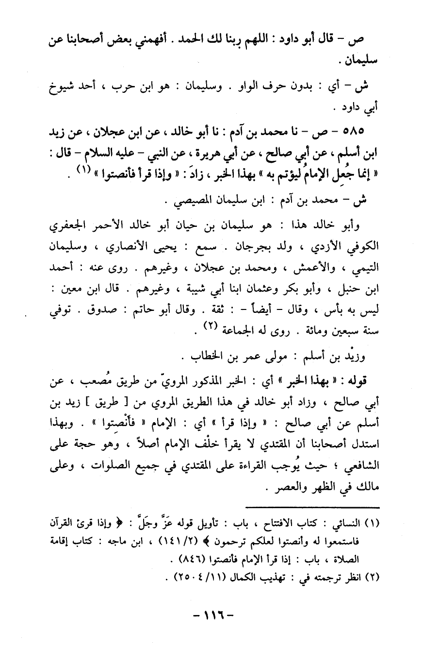 585- ص- نا محمد بن اَدم: نا أبو خالد، عن ابن عجلان، عن زبد ابن أسلم، عن أبي صالح، عن أبي هريرة، عن النبي- عليه السلام- قال: " إنما جُعِل الإمامُ ليؤتم به " بهذا الخبر، زادَ: " وإذا قرأ فأنصتوا " (1) . ش- محمد بن آدم: ابن سليمان المصيصي.