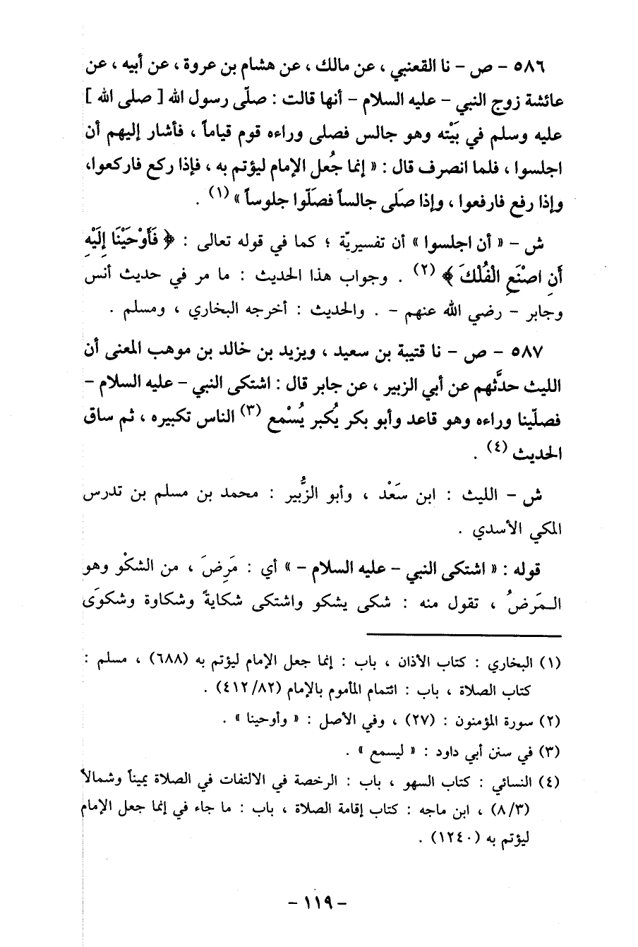 586- ص- نا القعنبي، عن مالك، عن هشام بن عروة، عن أبيه، عن عائشة زوج النبي- عليه السلام- أنها قالت: صلّى رسول الله [صلى الله] عليه وسلم في بَيْته وهو جالس فصلى وراءه قوم قياما، فأشار إليهم أن اجلسوا، فلما انصرف قال: " إنما جُعل الإمام ليؤتم به، فإذا ركع فاركعوا، وإذا رفع فارفعوا، وإذا صَلى جالسا فصَلّوا جلوسا " (1) .