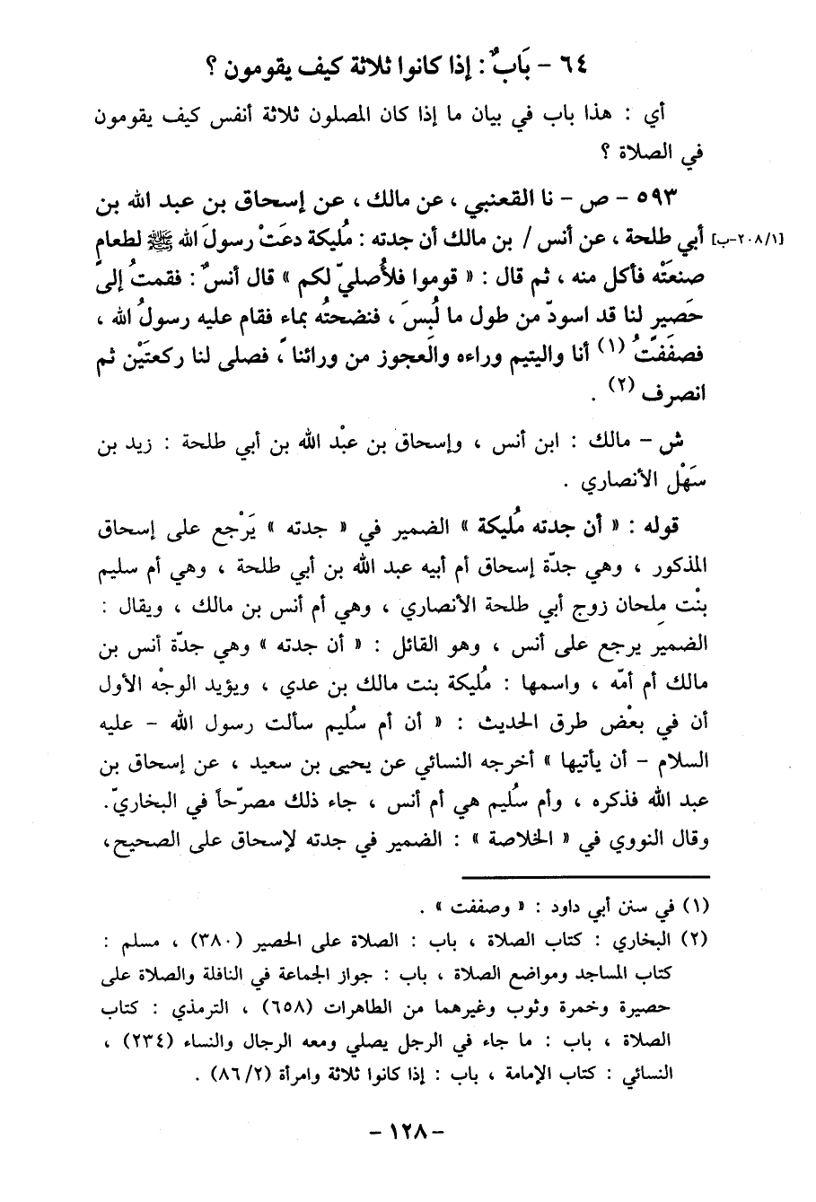 (2) البخاري: كتاب الصلاة، باب: الصلاة على الحصير (380) ، مسلم: كتاب المساجد ومواضع الصلاة، باب: جواز الجماعة في النافلة والصلاة على حصيرة وخمرة وثوب وغيرهما من الطاهرات (658) ، الترمذي: كتاب الصلاة، باب: ما جاء في الرجل يصلي ومعه الرجال والنساء (234) ، النسائي: كتاب الإمامة، باب: إذا كانوا ثلاثة وامرأة (2 / 86) .