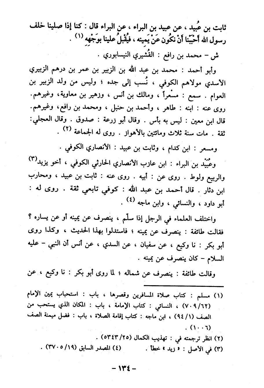 ثابت بن عُبيد، عن عبيد بن البراء، عن البراء قال: كنا إذا صلينا خلف رسول الله أحْببنا أنْ نكُون عَنْ يَمِينه، فيُقْبلُ علينا بوَجْهِهِ (1) .