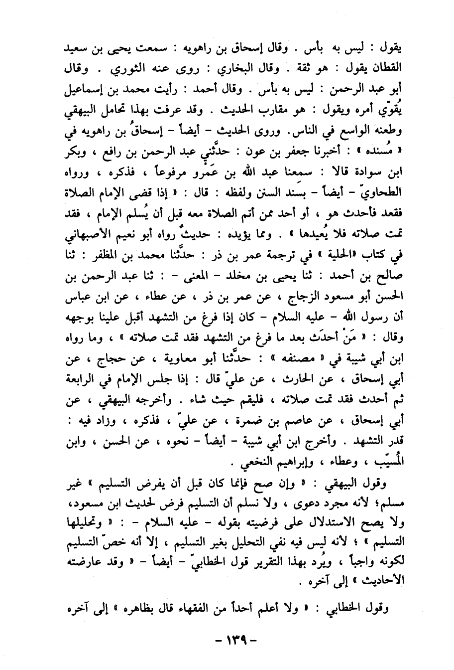 يقول: ليس به بأس. وقال إسحاق بن راهويه: سمعت يحيى بن سعيد القطان يقول: هو ثقة. وقال البخاري: روى عنه الثوري. وقال أبو عبد الرحمن: ليس به بأس. وقال أحمد: رأيت محمد بن إسماعيل يُقوي أمره ويقول: هو مقارب الحديث. وقد عرفت بهذا تحامل البيهقي وطعنه الواسع في الناس. وروى الحديث- أيضاً إسحاقُ بن راهويه في " مسنده ": أخبرنا جعفر بن عون: حدثني عبد الرحمن بن رافع، وبكر ابن سوادة قالا: سمعنا عبد الله بن عَمْرو مرفوعاً، فذكره، ورواه الطحاوي - أيضاً بسَند السنن ولفظه: قال: " إذا قضى الإمام الصلاة فقعد فأحدث هو، أو أحد ممن أتم الصلاة معه قبل أن يُسلم الإمام، فقد تمت صلاته فلا يُعيدها ". ومما يؤيده: حديث رواه أبو نعيم الأصبهاني في كتاب " الحلية " في ترجمة عمر بن ذر: حدثنا محمد بن المظفر: ثنا صالح بن أحمد: ثنا يحمى بن مخلد- المعنى-: ثنا عبد الرحمن بن الحسن أبو مسعود الزجاج، عن عمر بن ذر، عن عطاء، عن ابن عباس أن رسول الله- عليه السلام- كان إذا فرغ من التشهد أقبل علينا بوجهه وقال:" مَنْ أحدَث بعد ما فرغ من التشهد فقد تمت صلاته "، وما رواه ابن أبي شيبة في " مصنفه ": حدثنا أبو معاوية، عن حجاج، عن أبي إسحاق، عن الحارث، عن علي قال: إذا جلس الإمام في الرابعة ثم أحدث فقد تمت صلاته، فليقم حيث شاء. وأخرجه البيهقي، عن أبي إسحاق، عن عاصم بن ضمرة، عن علي، فذكره، وراد فيه: قدر التشهد. وأخرج ابن أبي شيبة- أيضاً نحوه، عن الحسن، وابن المسيب، وعطاء، وإبراهيم النخعي.