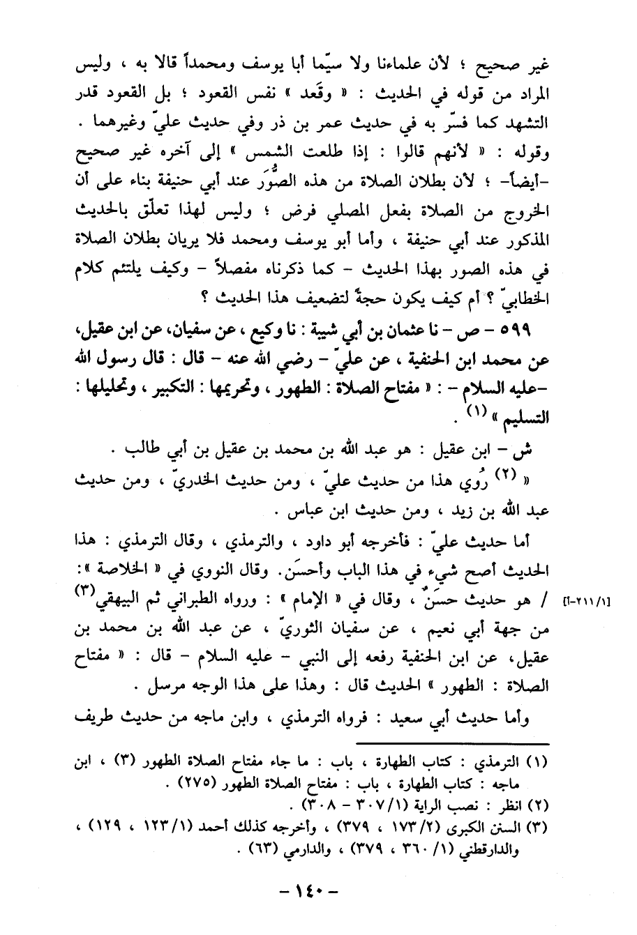 599- ص- نا عثمان بن أبي شيبة: نا وكيع، عن سفيان، عن ابن عقيل، عن محمد ابن الحنفية، عن علي- رضي الله عنه- قال: قال رسول الله - عليه السلام-: " مفتاح الصلاة: الطهور، وتحريمها: التكبير، وتحليلها: التسليم " (1) .