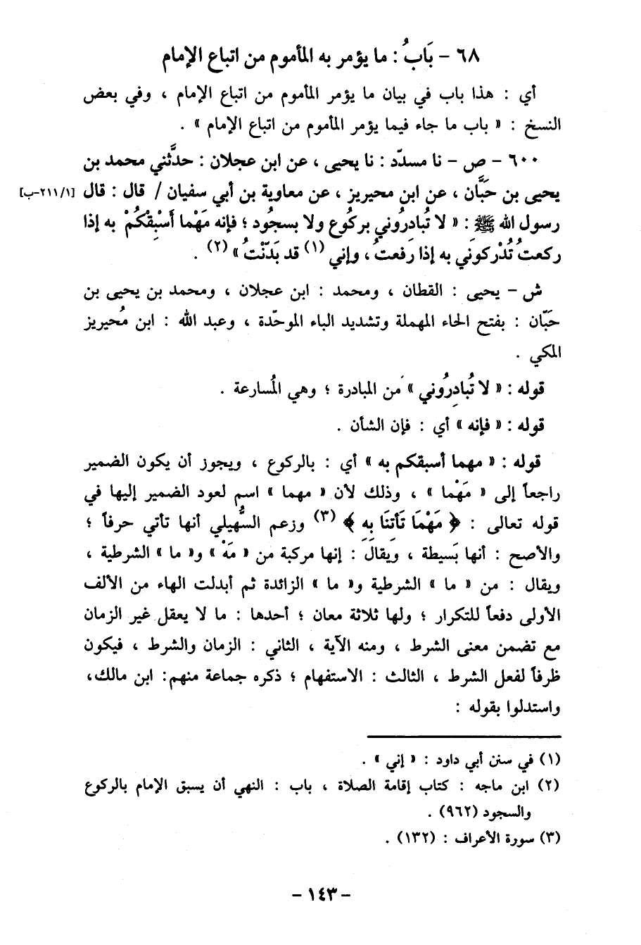 يحيى بن حبان، عن ابن محيريز، عن معاوية بن أبي سفيان / قال: قال [1/ 211 - ب] رسول الله صلى الله عليه وسلم: " لا تُبادرُوني بركُوع ولا بسجُود، فإنه مَهْما أسْبِقكُمْ به إذا