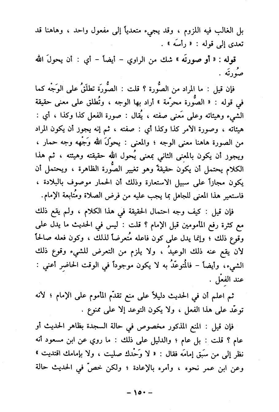 فإن قيل: ما المراد من الصُّورة؟ قلت: الصُّورَة تطلَقُ على الوَجْه كما في قوله: " الصُّورة محرمة " أراد بها الوجه، وتُطلق على معنى حقيقة الشيء وهيئاته وعلى مَعنى صفته، يُقال: صورة الفعل كذا وكذا، أي: هيئاته، وصورة الأمر كذا وكذا أي: صفته، ثم إنه يجوز أن يكون المراد من الصورة هاهنا معنى الوجه؟ والمعنى: يحولَ الله وَجْهه وجه حمار، ويجوز أن يكون بالمعنى الثاني بمعنى يُحول الله حقيقته وهيئته، ثم هذا الكلام يحتمل أن يكون حقيقةً وهو تغيير الصُورة الظاهرة، ويحتمل أن يكون مجازا على سبيل الاستعارة وذلك أن الحمار موصوف بالبلادة، فاستعير هذا المعنى للجاهل بما يجب علي من فرض الصلاة ومُتابعة الإمام. فإن قيل: كيف وجه احتمال الحقيقة في هذا الكلام، ولم يقع ذلك مع كثرة رفع المأمومين قبل الإمام؟ قلت: ليس في الحديث ما يدل على وقوع ذلك؛ وإنما يدل على كون فاعله متعرضا لذلك، وكون فعله صالحا لأن يقع عنه ذلك الوعيدُ، ولا يلزم من التعرض للشيء وقوع ذلك الشيء، وأيضا- فالمُتوعدُ به لا يكون موجوداً في الوقت الحاضِر أعني: عند الفِعْل.