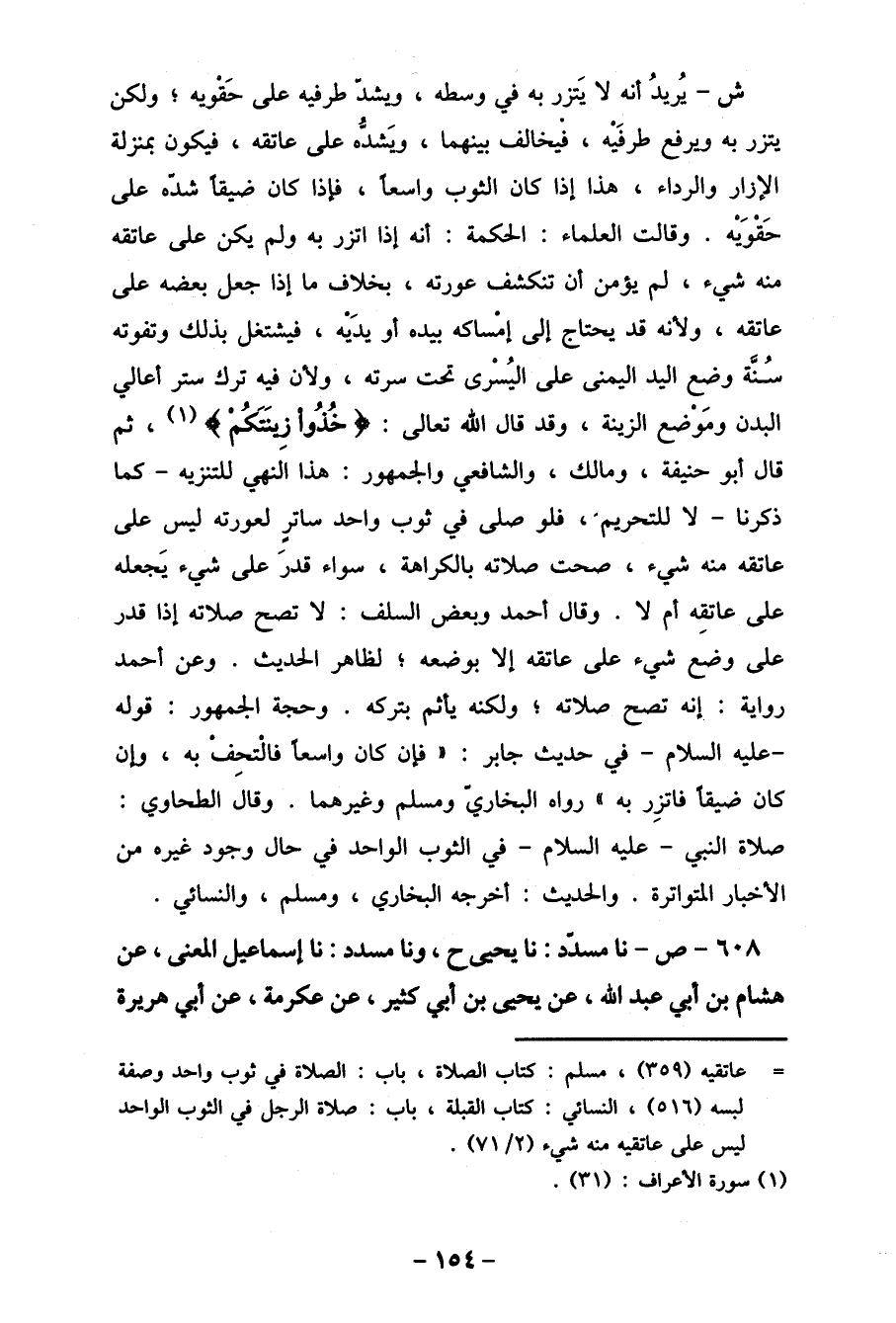 ش- يُريدُ أنه لا يَتزر به في وسطه، ويشد طرفيه على حَقْويه، ولكن يتزر به ويرفع طرفَيْه، فيخالف بينهما، ويَشدُّه على عاتقه، فيكون بمنزلة الإزار والرداء، هذا إذا كان الثوب واسعا، فإذا كان ضيقا شده على حَقْوَيْه. وقالت العلماء: الحكمة: أنه إذا اتزر به ولم يكن على عاتقه منه شيء، لم يؤمن أن تنكشف عورته، بخلاف ما إذا جعل بعضه على عاتقه، ولأنه قد يحتاج إلى إمساكه بيده أو يدَيه، فيشتغل بذلك وتفوته سُنة وضع اليد اليمنى على اليُسْرى تحت سرته، ولأن فيه ترك ستر أعالي البدن ومَوْضع الزينة، وقد قال الله تعالى: {خُذوا زِينَتَكُمْ} (1) ، ثم قال أبو حنيفة، ومالك، والشافعي والجمهور: هذا النهي للتنزيه- كما ذكرنا- " للتحريم "، فلو صلى في ثوب واحد ساترٍ لعورته ليس على عاتقه منه شيء، صحت صلاته بالكراهة، سواء قدرَ على شيء يَجعله على عاتقِه أم لا. وقال أحمد وبعض السلف: لا تصح صلاته إذا قدر على وضع شيء على عاتقه إلا بوضعه، لظاهر الحديث. وعن أحمد رواية: إنه تصح صلاته، ولكنه يأثم بتركه. وحجة الجمهور: قوله - عليه السلام- في حديث جابر: " فإن كان واسعا فالْتحِفْ به، وان كان ضيقا فاتزِر به " رواه البخاري ومسلم وغيرهما. وقال الطحاوي: صلاة النبي- عليه السلام- في الثوب الواحد في حال وجود غيره من " لأخبار المتواتر " والحديث: أخرجه البخاري، ومسلم، والنسائي. 608- ص- نا مسدد: نا يحيى ح، ونا مسدد: ما إسماعيل المعنى، عن هشام بن أبي عبد الله، عن يحي بن أبي كثير، عن عكرمة، عن أبي هريرة