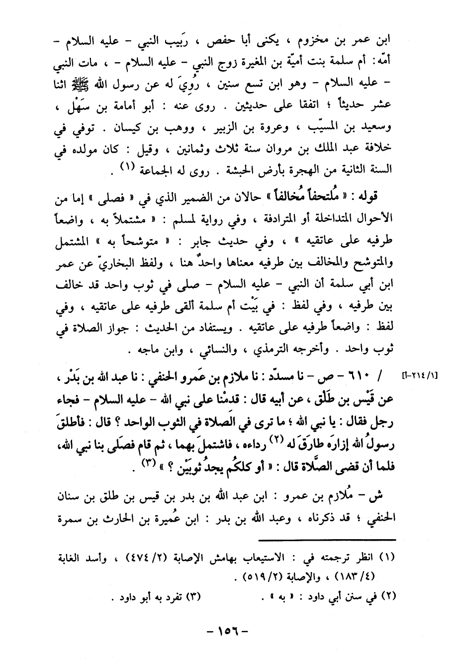 [1/ 214 - أ] / 610- ص- نا مسدد: نا ملازم بن عَمرو الحنفي: نا عبد الله بن بَدْر، عن قَيْس بن طَلق، عن أبيه قال: قدمْنا على نبي الله- عليه السلام- فجاء رجل فقال: نا نبي الله، ما ترى في الَصلاة في الثوب الواحد؟ قال: فأطلقَ رسولُ الله إزارَه طارَقَ له (2) رداءه، فاشتملَ بهِما، ثم قام فصَلى بنا نبي الله، فلما أن قضى الصلاة قال: " أو كلكُم يجدُ ثوبيْن؟ " (3) .