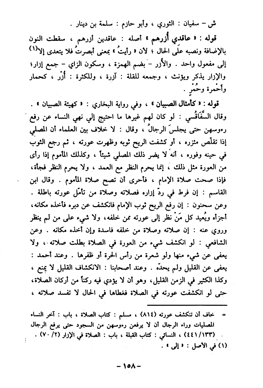 قوله: " كأمثال الصبيان "، وفي رواية البخاري: " كهيئة الصبيان" وقال السفَاقُسي: لو كان لهم غيرها ما احتيج أي نهي النساء عن رفع رءوسهن حتى يجلسَ الرجالُ، وقال: لا خلاف بين العلماء أن المصلي إذا تقلّص مئزره، أو كشفت الريح ثوبه وظهرت عورته، ثم رجع الثوب في حينه وفوره، أنه " لا يضر ذلك المصلي شيئا، وكذلك المأموم إذا رأى من العورة مثل ذلك، إنما يحرم النظر مع العمد، ولا يحرم النظر فجأة، فإذا صحت صلاة الإمام، فأحرى أن تصح صلاة المأموم. وقال ابن القاسم: إن فرط في رد إزاره فصلاته وصلاة من تأمل عورته باطلة. وعن سحنون: إن رفع الريح ثوب الإمام فانكشف عن دبره فأخذه مكانه، أجزأت ويُعيد كل مَن نظر إلى عورته ممن خلفه، ولا شيء على من لم ينظر وروي عنه: إن صلاته وصلاة من خلفه فاسدة وإن أخذه مكانه. وعن الشافعي: لو انكشف شيء من العورة في الصلاة بطلت صلاته، ولا يعفى عن شيء منها ولو شعرة من رأس الحرة أو ظفرها. وعند أحمد: يعفى عن القليل ولم يحدها. وعند أصحابنا: الانكشاف القليل لا يمنع، وكذا الكثير في الزمن القليل، وهو أن لا يؤدي فيه ركنا من أركان الصلاة، حتى لو انكشفت عورته في الصلاة فغطاها في الحال لا تفسد صلاته