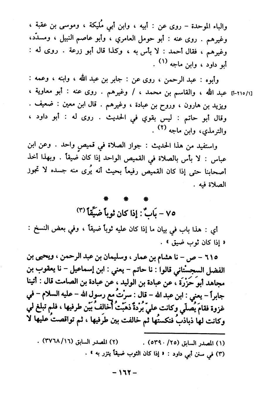 615- ص- نا هشام بن عمار، وسليمان بن عبد الرحمن، ويحيى بن الفضل السِجسْتاني قالوا: نا حاتم- يعني: ابن إسماعيل- نا يعقوب بن مجاهد أبو حَزْرَة، عن عبادة بن الوليد، عن عبادة بن الصامت قال: أتينا جابرا- يعني: ابن عبد الله- قال: سرتُ مع رسول الله- عليه السلام- في غزوة فقامَ يُصلي وكانت علي بُردة ذهبتُ أخالفُ بَين طرفيها، فلم تبلغ لي وكانت لها ذباذبُ فنكستُها ثم خالفت بين طرَفيها، ثم تواقصتُ عليها لا