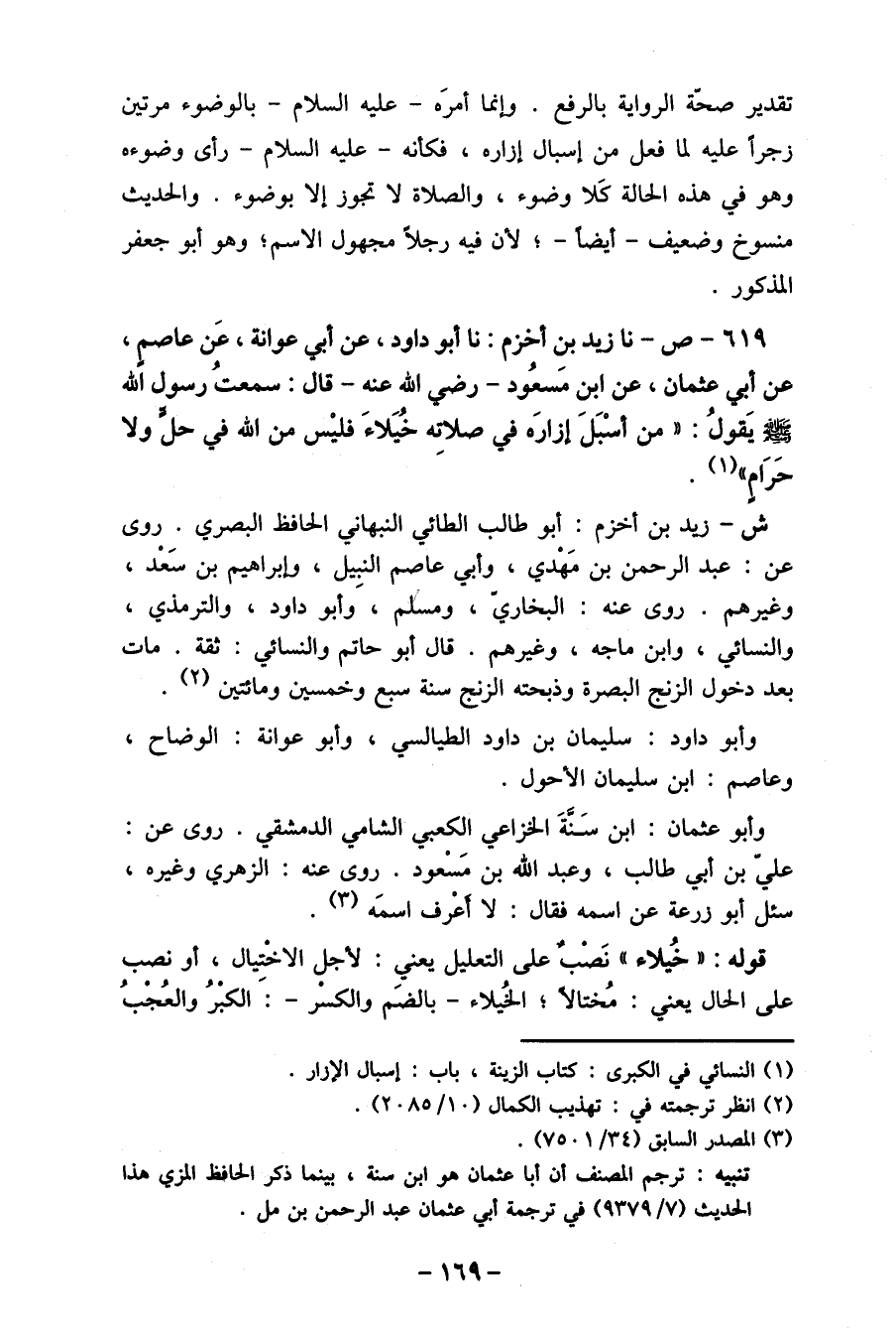 619- ص- نا زبد بنِ أخزم: نا أبو داود، عن أبي عوانة، عَن عاصمٍ، عن أبي عثمان، عن ابن مسعُود- رضي الله عنه- قال: سمعتُ رسول الله صلى الله عليه وسلم يَقول: " من أسْبَلَ إزارَه في صلاته خُيَلاءَ فليْس من الله في حل ولا حَرَ أم " (1) .