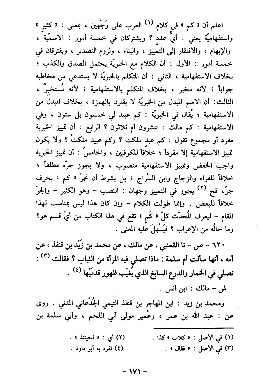 اعلم أن " كم " في كلام (1) العرب على وَجْهين، بمعنى: " كثيرِ " واستفهاميّة يعني: أيُ عدد؟ ويشتركان في خمسة أمور: الاسمية، والإبهام، والافتقار إلى التمَييز، والبناء، ولزوم التصدير، ويفترقان في خمسة أمور: الأول: أن الكلام مع الخبرية يحتمل الصدق والكذب، بخلاف الاستفهامية، الثاني: أن المتكلم بالخبريّة لا يستدعي من مخاطبه جواباً، لأنه مخبر، بخلاف المتكلم بالاستفهامية، لأنه مُستخبِرْ، الثالث: أن الاسم المبدل من الخبريّة لا يقترن بالهمزة، بخلاف المبدل من الاستفهامية، يُقال في الخبرية: كم عبيد لي خمسون بل ستون، وفي الاستفهامية: كم مالك: عشرون أم ثلاثون؟ الرابع: أن تمييز الخبرية مفرد أو مجموع تقول: كم عبد ملكت؟ وكم عبيد ملكتُ؟ ولا يكون تمييز الاستفهامية إلا مفرداً، خلافاً للكوفيين، والخامسُ: أن تمييز الخبرية واجب الخفض وتمييز الاستفهامية منصوب، ولا يجوز جرة مطلقاً، خلافاً للفراء الزجاج وابن السِّراج، بل بشرط أن تجر " كم " بحرف جر، فح (2) يجوز في التمييز وجهان: النصب- وهو الكثير- والجرّ خلافاً للبعض. وإنما طولت الكلام- وإن كان هذا ليس بمناسب لهذا المقام- ليعرف المُحدّث كل " كم " تقع في هذا الكتاب من أي قسم هو؟ وما حالُه من الإعراب؟ فيَسْهلَ علي المعنى.