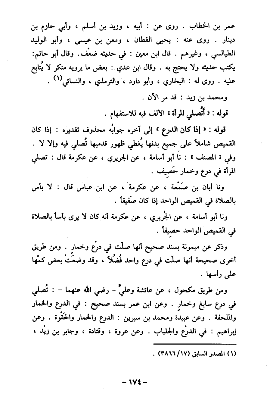 ومن طريق مكحول، عن " عائشة وعلي- رضي الله عنهما-: تُصلي في درع سابغ وخمارِ. وعن ابن عمر بسند صحيح: في الدرع والخمار والملحفة. وعن عبيدة ومحمد بن سيرين: الدرع والخمار والحَقوة. وعن إبراهيم: في الدرع والجلباب. وعن عروة، وقتادة، وجابر بن زيْد،