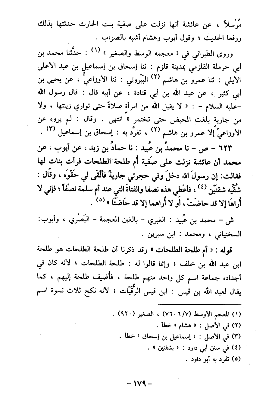 وروى الطبراني في " معجمه الوسط والصغير " (1) : حدثنا محمد بن أبي حرملة القلزمي بمدينة قلزم: ثنا إسحاق بن إسماعيل بن عبد الأعلى الأيلي: ثنا عمرو بن هاشم (2) البَيْروتي: ثنا الأوزاعيُّ، عن يحيى بن أبي كثير، عن عبد الله بن أبي قتادة، عن أبيه قال: قال رسول الله - عليه السلام-: " لا يقبل الله من امرأة صلاةً حتى تواري زينتها، ولا من جارية بلغت المحيض حتى تختمر " انتهى. وقال: لم يروه عن الأوزاعي إلا عمرو بن هاشم (2) ، تفرد به: إسحاق بن إسماعيل (3) . 623- ص- نا محمدُ بن عُبيد: نا حمادُ بن زيد، عن أيوب، عن محمد أن عائشة نزلت على صَفية أم طلحة الطلحات فرأت بنات لها فقالت: إن رسول الله دخلَ وفي حجرتي جارية فألقَى لي حَقْوَه، وقًال: شُقيه شقتَيْن (4) ، فأعْطي هذه نصفا والفتاةَ التي عند أم سلمة نصفا، فإني لا أراها إلا قد حاضَتْ، أَو لا أراهما إلا قد حَاضَتَا ". (5)