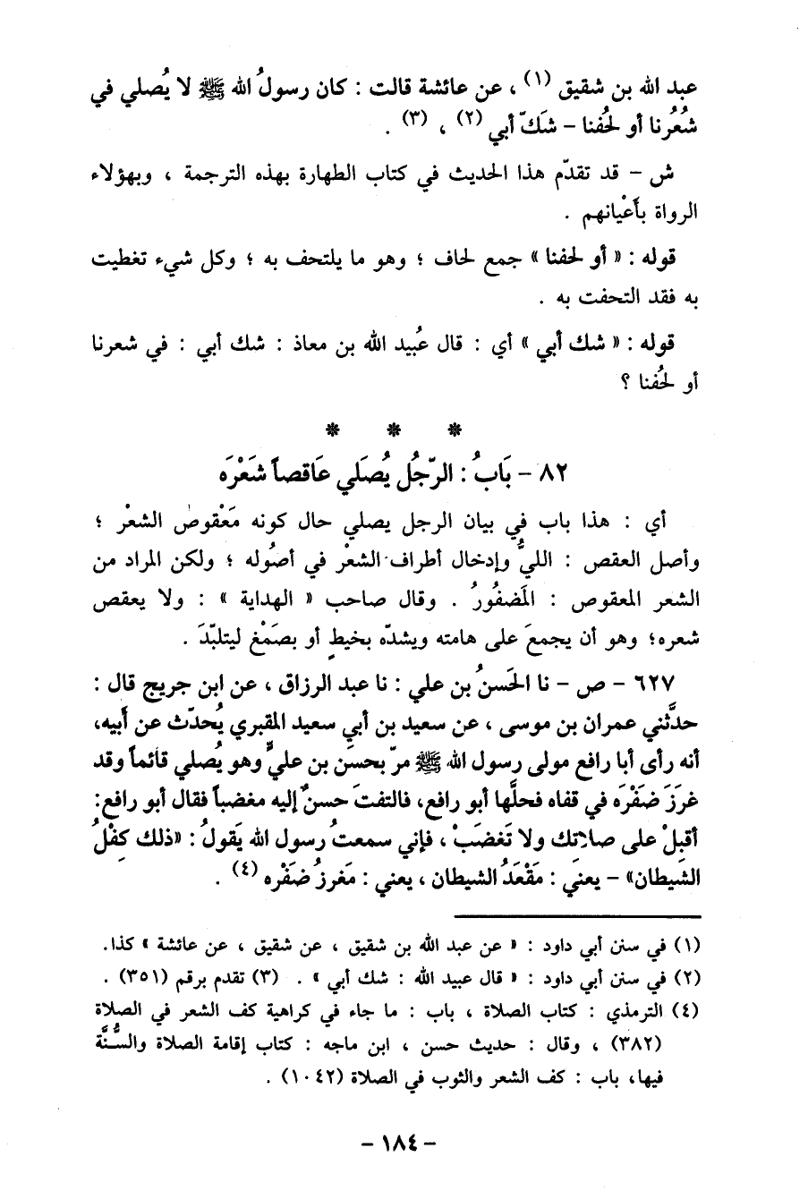 (4) الترمذي: كتاب الصلاة، باب: ما جاء في كراهية كف الشعر في الصلاة (382) ، وقال: حديث حسن، ابن ماجه: كتاب إقامة الصلاة والسنة فيها، باب: كف الشعر والثوب في الصلاة (1042) .