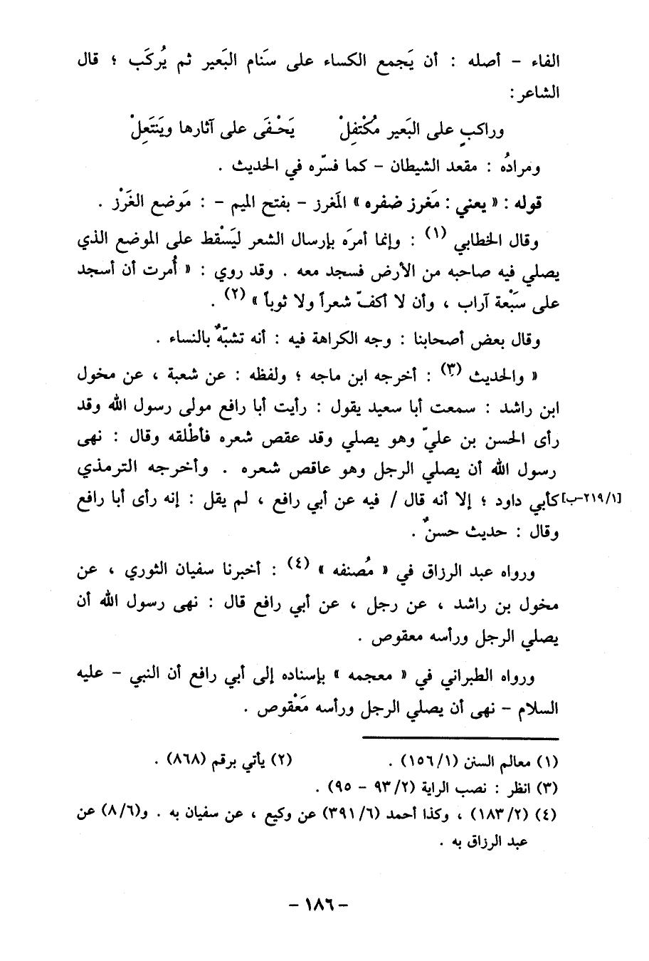 ورواه عبد الرزاق في" مُصنفه " (4) : أخبرنا سفيان الثوري، عن مخول بن راشد، عن رجل، عن أبي رافع قال: نهى رسول الله أن يصلي الرجل ورأسه معقوص.