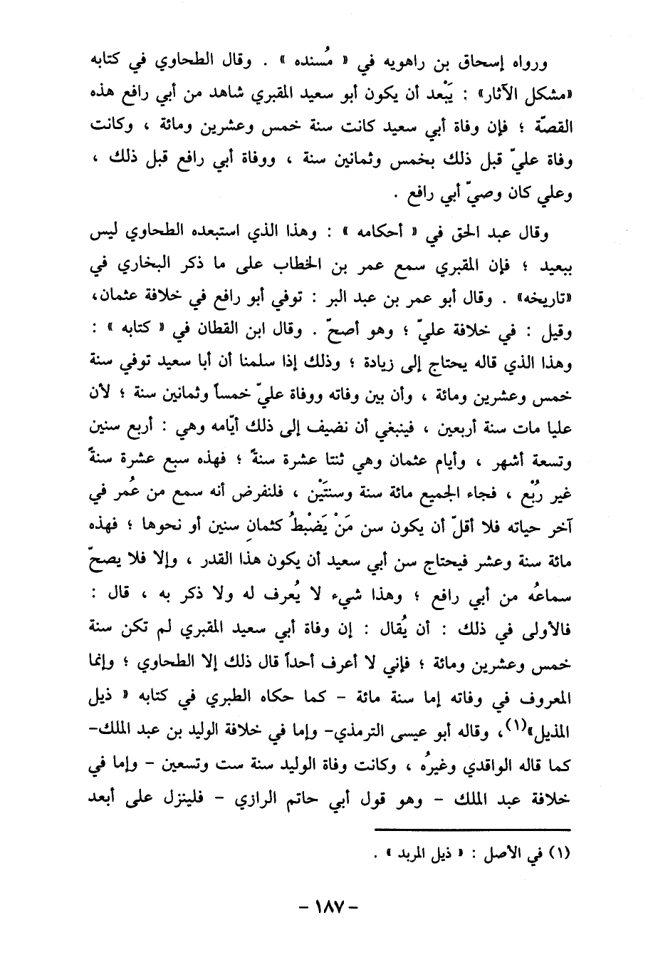 وقال عبد الحق في " أحكامه ": وهذا الذي استبعده الطحاوي ليس ببعيد، فإن المقبري سمع عمر بن الخطاب على ما ذكر البخاري في " تاريخه ". وقال أبو عمر بن عبد البر: توفي أبو رافع في خلافة عثمان، وقيل: في خلافة علي، وهو أصح. وقال ابن القطان في " كتابه ": وهذا الذي قاله يحتاج إلى زيادة، وذلك إذا سلمنا أن أبا سعيد توفي سنة خمس وعشرين ومائة، وأن بين وفاته ووفاة عليّ خمساً وثمانين سنة، لأن عليا مات سنة أربعين، فينبغي أن نضيف إلى ذلك أيّامه وهي: أربع سنين وتسعة أشهر، وأيام عثمان وهي ثنتا عشرة سنةً، فهذه سبع عشرة سنةً غير رُبْع، فجاء الجميع مائة سنة وسنتَيْن، فلنفرض أنه سمع من عُمر في آخر حياته فلا أقلّ أن يكون سن مَنْ يَضْبطُ كثمانِ سنين أو نحوها، فهذه مائة سنة وعشر فيحتاج سن أبي سعيد أن يكون هذا القدر، وإلا فلا يصحّ سماعُه من أبي رافع؟ وهذا شيء لا يُعرف له ولا ذكر به، قال: فالأولى في ذلك: أن يُقال: إن وفاة أبي سعيد المقبري لم تكن سنة خمس وعشرين ومائة، فإني لا أعرف أحداً قال ذلك إلا الطحاوي، وإنما المعروف في وفاته إما سنة مائة- كما حكاه الطبري في كتابها" ذيل المذيل " (1) ، وقاله أبو عيسى الترمذي- وإما في خلافة الوليد بن عبد الملك- كما قاله الواقدي وغيرُه، وكانت وفاة الوليد سنة ست وتسعين- وإما في خلافة عبد الملك- وهو قول أبي حاتم الرازي- فلينزل على أبعد