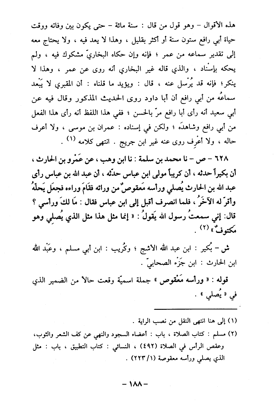 628- ص- نا محمد بن سلمة: نا ابن وهب، عن عَمْرو بن الحارث، أن بكيراً حدثه، أن كريباً مولى ابن عباس حدثه، أن عبد الله بن عباس رأى عبد الله بن الحارث يُصلي ورأسه مَعقوصٌ من ورائه فقَامَ وراءه فجعَل يَحلهُ وأقر له الآخر، فلما انصرف أقبل إلى ابن عباس فقال: مَا لكَ ورأسي؟ قال: إني سمعتُ رسول الله يَقولُ: " إنما مثل هذا مثل الذي يُصلِي وهو مكتوف " (2) .