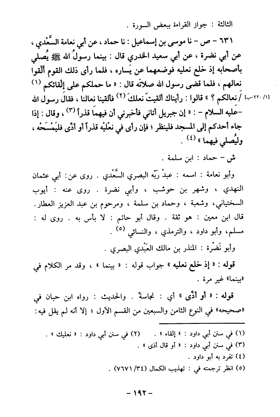 631- ص- نا موسى بن إسماعيل: نا حماد، عن أبي نعامة السعْدي، عن أبي نضرة، عن أبي سعيد الخدري قال: بينما رسولُ الله ص يُصلي بأصحابه إذ خلع نعليه فوضعهما عن يَساره، فلما رأى ذلك القوم ألقوا نِعالهم، فلما قضى رسول الله صلاتَه قال: " ما حملكم على إلقائكم (1) / [1/220 - ب] نعالكم؟ " قالوا: رأيناك ألقيتَ نعلكَ (2) فألقينا نعالنا، فقال رسول الله - عليه السلام-: " إن جبريل أتاني فأخبرني أن فيهمَا قذراً (3) ، وقال: إذا جاء أحدكم إلى المسجد فلينظر، فإن رأى في نعْليْه قذراً أو أذى فليَمْسَحْه، وليُصلي فيهما " (4) .