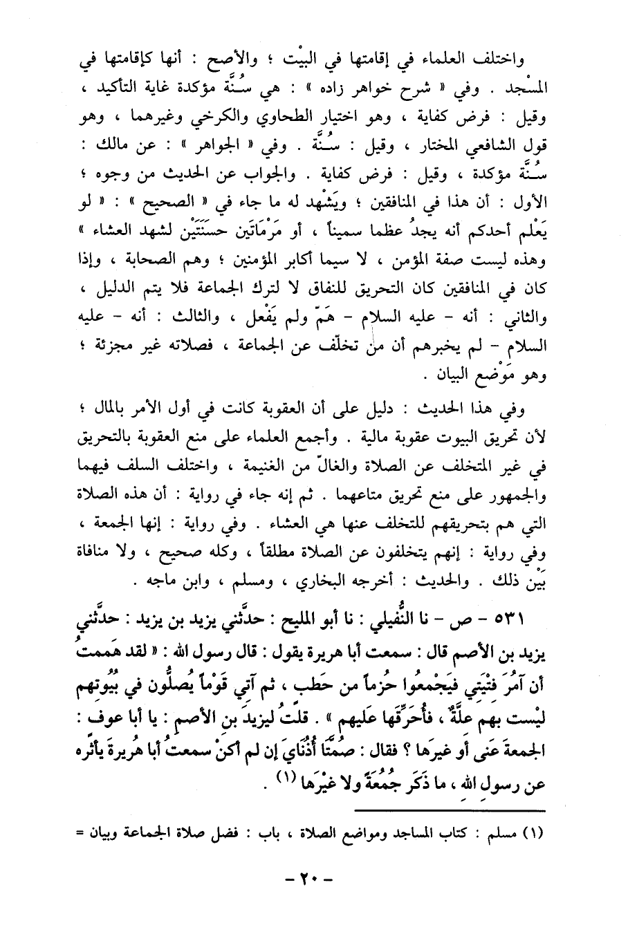 531- ص- نا النفيلي: نا أبو المليح: حدَّثني يزيد بن يزيد: حدَّثني يزيد بن الأصم قال: سمعت أبا هريرة يقول: قال رسول الله: " لقد هَممت أن آمُرَ فِتْيَتِي فيَجْمعُوا حُزما من حَطب، ثم آتِي قوماً يُصفُون في بُيُوتِهم ليْست بهم علَّةٌ، فأحرِّقَها عَليهم ". قلًتُ ليزيدَ بنِ الأصم: يا أبا عوفٍ: الجمعةَ عَنى أَو غيرَها؟ فقال: صامتا أذُنَايَ إن لم كنْ سمعتُ أبا هُريرةَ وأثره عن رسولِ اللهِ، ما ذَكَر جُمُعَةً ولا غيرها (1) .