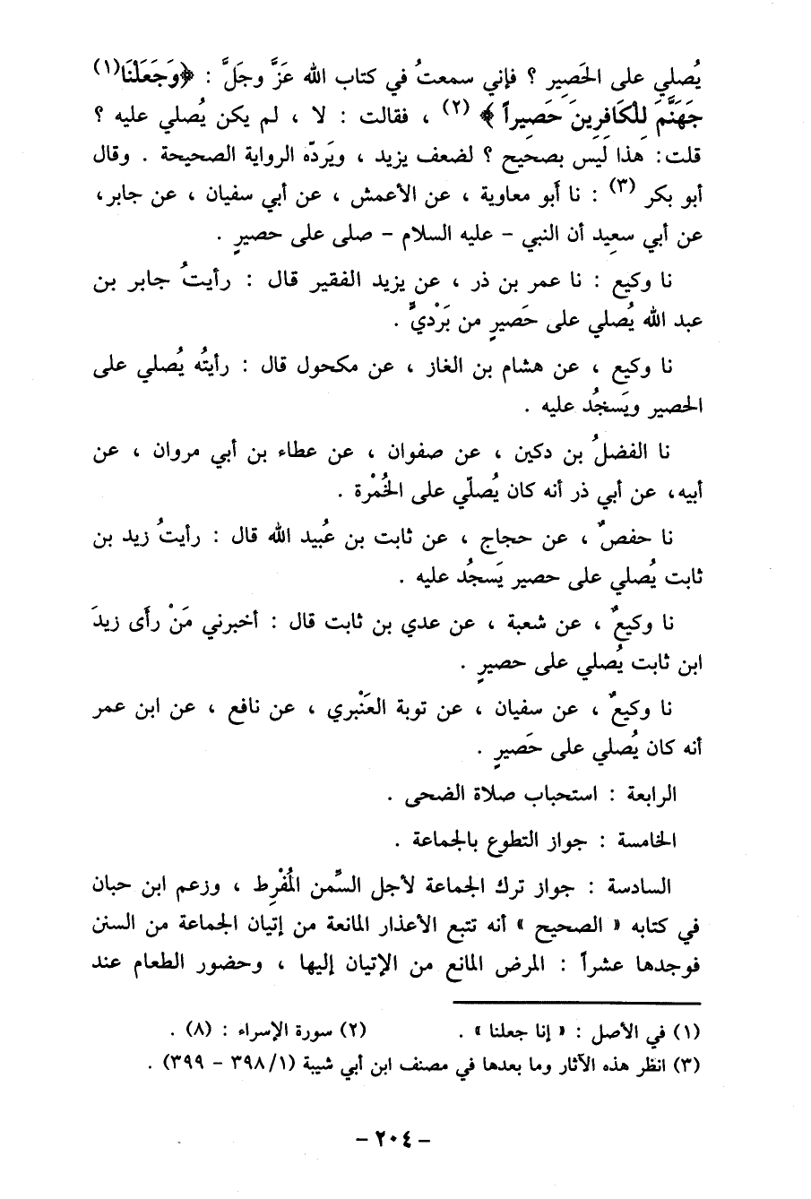 يُصلي على الحَصِير؟ فإني سمعتُ في كتاب الله عَر وجَل: " وجَعَلنَا (1) جَهَنَّمَ للكافرِينَ حَصِيراَ " (2) ، فقالت: لا، لم يكن يُصلي عليه؟ قلت: هَذا لَيس بصحيح؟ لضعف يزيد، ويَردّه الرواية الصحيحة. وقال أبو بكر (3) : نا أبو معاوية، عن الأعمش، عن أبي سفيان، عن جابر، عن أبي سعِيد أن النبي- عليه السلام- صلى على حصيرٍ.