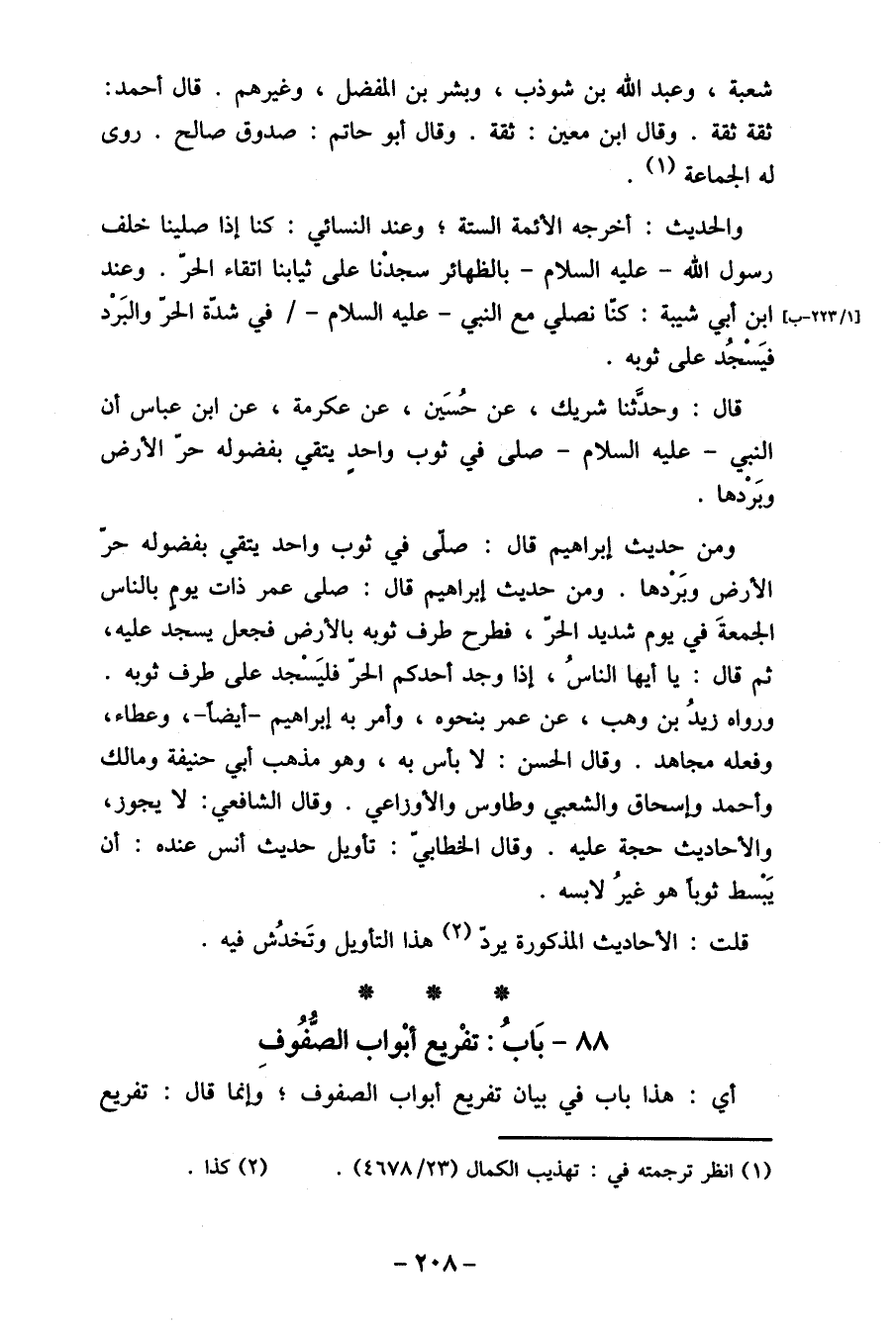 [1/223-ب] ابن أبي شيبة: كنا نصلي مع النبي- عليه السلام- / في شدة الحر والبَرْد فيَسجُد على ثوبه.