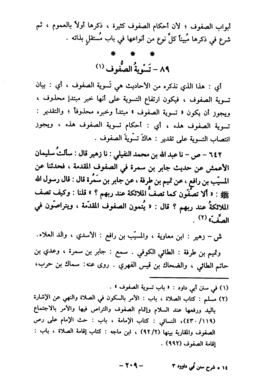 642- ص- نا عبد الله بن محمد النفيلي: نا زهير قال: سألتُ سليمان الأعمش عن حديث جابر بن سمرة في الصفوف المقدمة، فحدثنا عن المسيب بن رافع، عن تميم بن طرفة، عن جابر بن سَمُرة قال: قال رسول الله صلى الله عليه وسلم " ألا تصُفون كما تصف الملائكة عند ربهم؟ " قلنا: وكيف تصف الملائكةُ عند ربهم؟ قال: " يُتمون الصفوف المقدمة، ويتراصون في الصف " (2) .