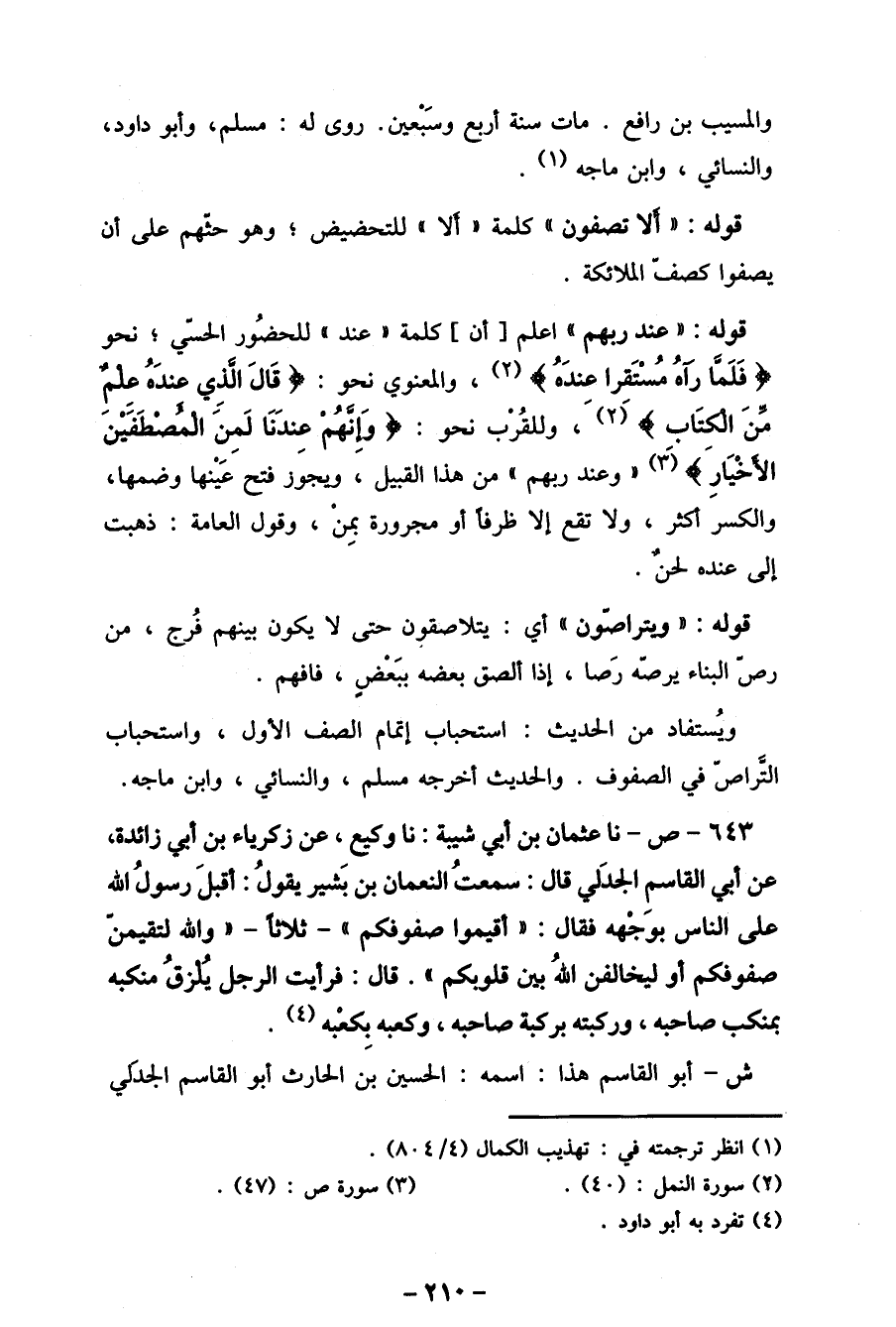 643- ص- نا عثمان بن أبى شيبة: نا وكيع، عن زكرياء بن أبى زائدة، عن أبي القاسمِ الجدَلي قال: سمعتُ النعمان بن بَشير يقولُ: أقبلَ رسولُ الله على الناس بوجْهه فقال:" أقيموا صفوفكم " - ثلاثا- " والله لتقيمن صفوفكم أو ليخالفن اللهُ بين قلوبكم ". قال: فرأيت الرجل يُلزقُ منكبه بمنكب صاحبه، وركبته بركبة صاحبه، وكعبه بِكعْبه (4) .