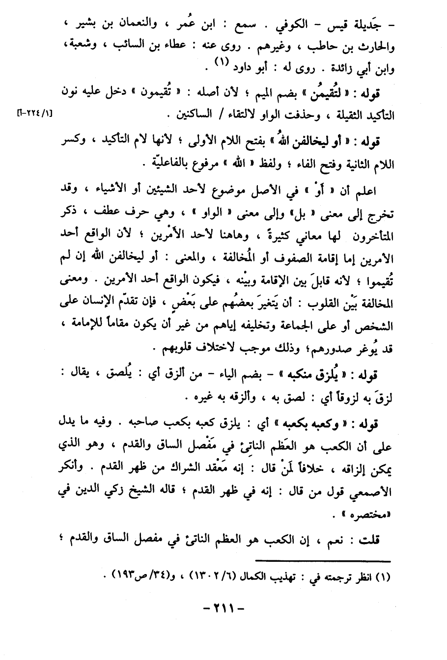 قوله: " وكعبه بكعبه " أي: يلزق كعبه بكعب صاحبه. وفيه ما يدل على أن الكعب هو العَظم الناتِئ في مَفْصل الساق والقدم، وهو الذي يمكن إلزاقه، خلافاً لمَنْ قال: إنه مَعْقد الشراك من ظهر القدم. وأنكر الأصمعي قول من قال: إنه في ظهر القدم، قاله الشيخ زكي الدين في " مختصره".