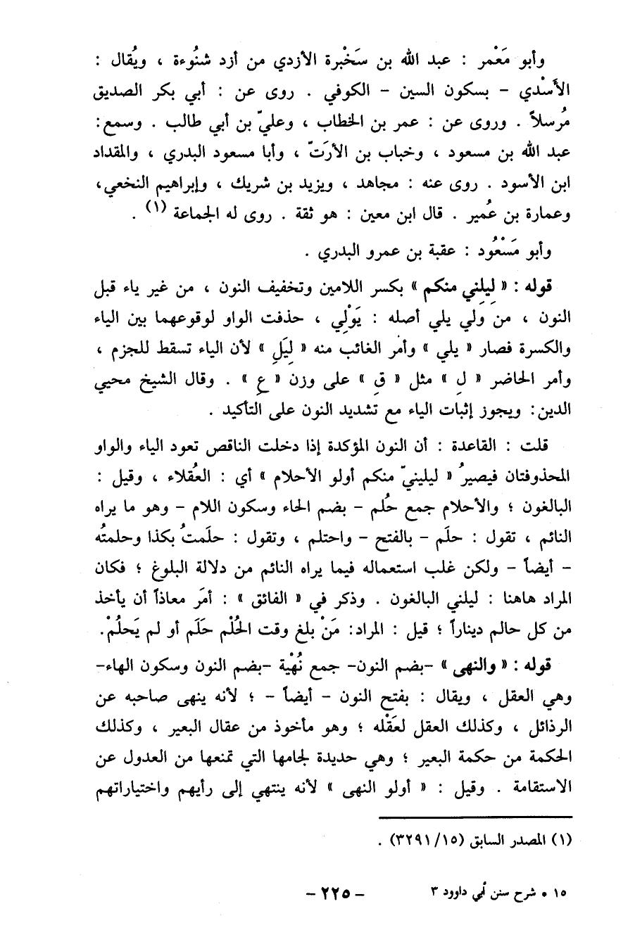 قلت: القاعدة: أن النون المؤكدة إذا دخلت الناقص تعود الياء والواو المحذوفتان فيصيرُ " ليليني منكم أولو الأحلام " أي: العُقلاء، وقيل: البالغون، والأحلام جمع حُلم- ب " م الحاء وسكون اللام- وهو ما يراه النائم، تقول: حلَم- بالفتح- واحتلم، وتقول: حلَمتُ بكذا وحلمتُه - أيضاً ولكن غلب استعماله فيما يراه النائم من دلالة البلوغ، فكان المراد هاهنا، ليلني البالغون. وذكر في " الفائق ": أمَر معاذا أن يأخذ من كل حالم دينارا، قيل: المراد: مَنْ بلغ وقت الحُلْم حَلَم أو لم يَحلُمْ. قوله: " والنهى "- بضم النون- جمع نُهْية- بضم النون وسكون الهاء- وهي العقل، ويقال: بفتح النون- أيضاً-، لأنه ينهى صاحبه عن الرذائل، وكذلك العقل لعَقْله، وهو مأخوذ من عقال البعير، وكذلك الحكمة من حكمة البعير، وهي حديدة لجامها التي تمنعها من العدول عن الاستقامة. وقيل: " أولو النهى " لأنه ينتهي إلى رأيهم واختياراتهم