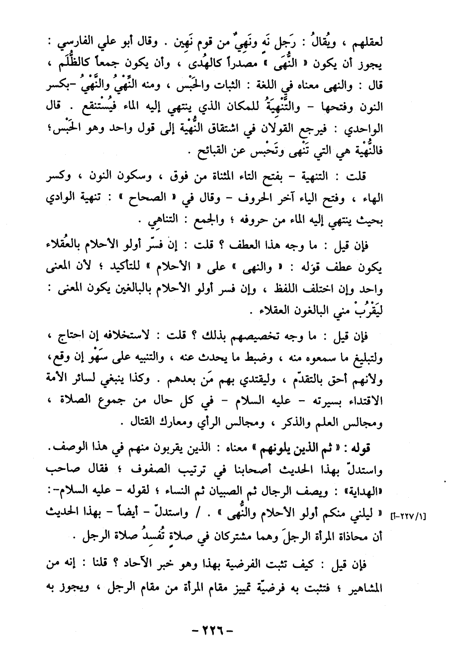 [1/227-أ] " ليلني منكم أولو الأحلام والنهى". / واستدلّ- أيضاً بهذا الحديث أن محاذاة المرأة الرجلَ وهما مشتركان في صلاةِ تُفسِدُ صلاة الرجل.