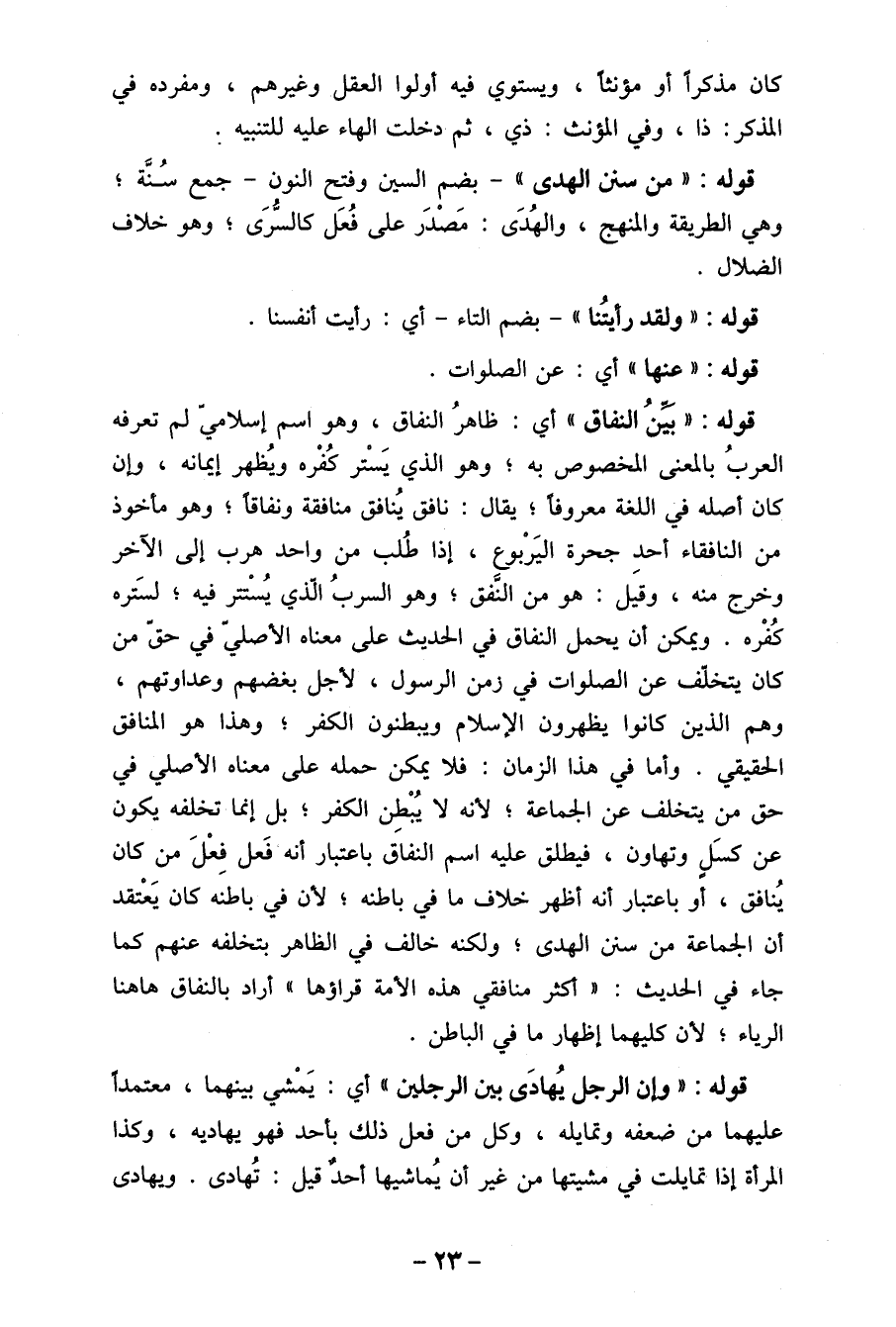 قوله: "من سنن الهدى "- بضم السين وفتح النون- جمع سُنَّة، وهي الطريقة والمنهج، والهُدَى: مَصْدر على فُعَل كالسُّرَى، وهو خلاف الضلال.