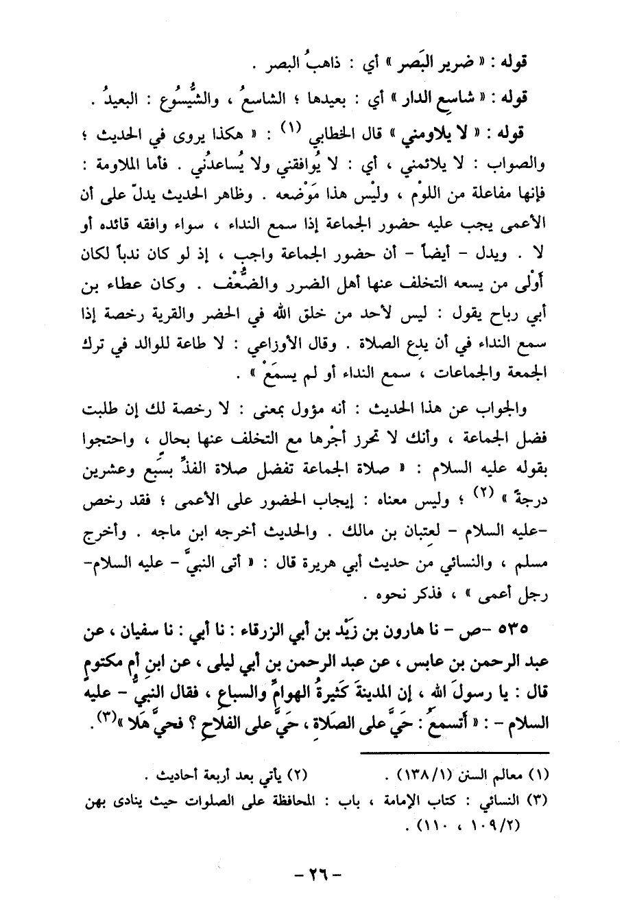 535- ص- نا هارون بن زَيْد بن أبي الزرقاء: لا أميي: نا سفيان، عن عبد الرحمن بن عابس، عن عبد الرحمن بن أبي ليلى، عن ابنِ أم مكتومٍ قال: نا رسولَ الله، إن المدينةَ كَثيرةُ الهوام والسباع، فقال النبي- عليه السلام-: لا أتسمع: حَي على الصَلاةِ، حَي على الفلاح؟ فحيًّ هَلا، (3) .